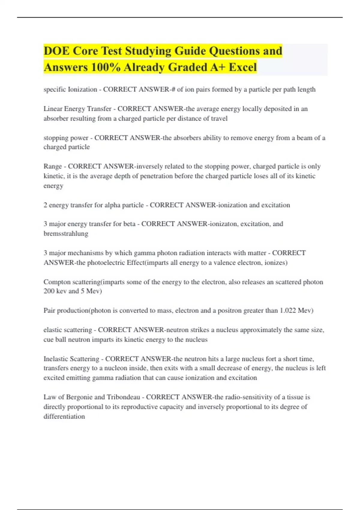 DOE Core Test Studying Guide Questions and Answers 100% Already Graded A+ Excel specific Ionization - CORRECT ANSWER-# of ion pairs formed by a particle per path length Linear Energy Transfer - CORRECT ANSWER-the average energy locally deposited in an absorber resulting from a charged particle per distance of travel stopping power - CORRECT ANSWER-the absorbers ability to remove energy from a beam of a charged particle Range - CORRECT ANSWER-inversely related to the stopping power, charged particle is only kinetic, it is the average depth of penetration before the charged particle loses all of its kinetic energy 2 energy transfer for alpha particle - CORRECT ANSWER-ionization and excitation 3 major energy transfer for beta - CORRECT ANSWER-ionizaton, excitation, and bremsstrahlung 3 major mechanisms by which gamma photon radiation interacts with matter - CORRECT ANSWER-the photoelectric Effect(imparts all energy to a valence electron, ionizes) Compton scattering(imparts some of the energy to the electron, also releases an scattered photon 200 kev and 5 Mev)
