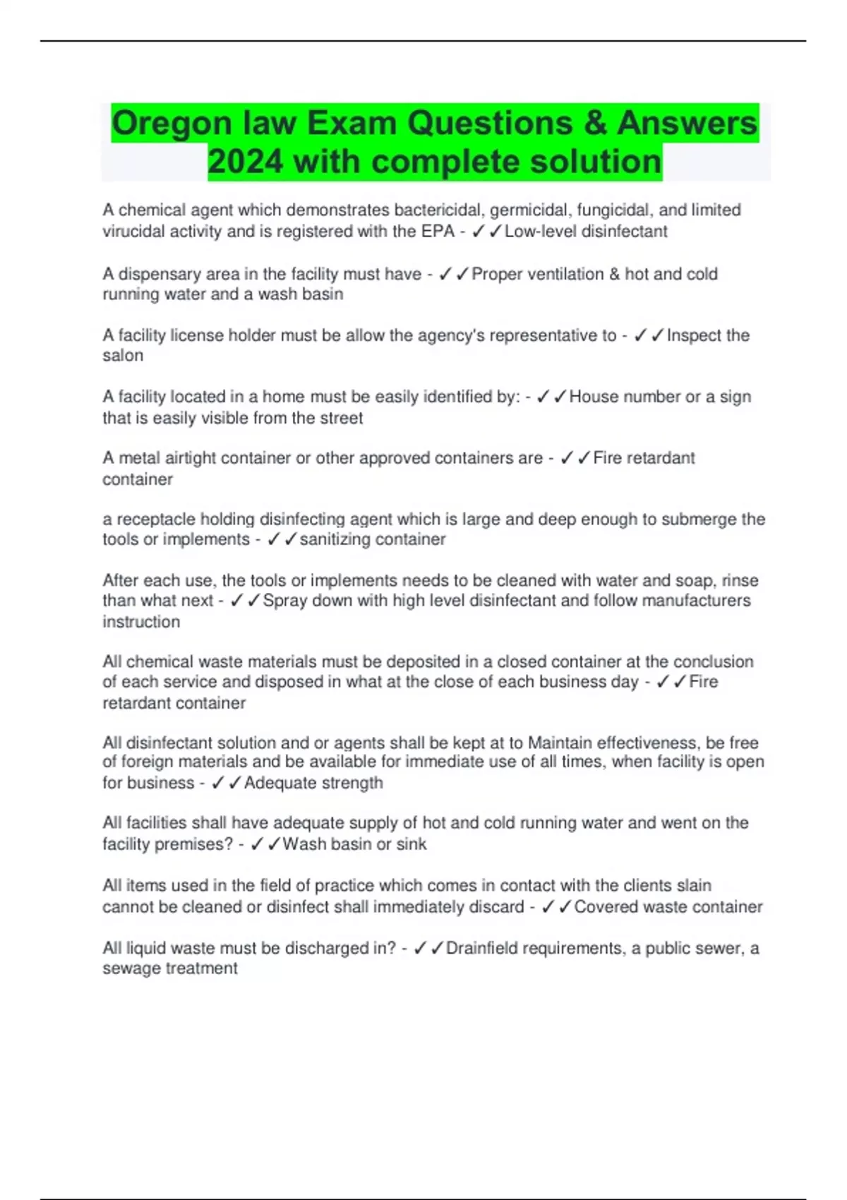 Oregon law Exam Questions & Answers 2024 with complete solution A chemical agent which demonstrates bactericidal, germicidal, fungicidal, and limited virucidal activity and is registered with the EPA - Low-level disinfectant A dispensary area in the facility must have - Proper ventilation & hot and cold running water and a wash basin A facility license holder must be allow the agency's representative to - Inspect the salon A facility located in a home must be easily identified by: - House number or a sign that is easily visible from the street A metal airtight container or other approved containers are - Fire retardant container a receptacle holding disinfecting agent which is large and deep enough to submerge the tools or implements - sanitizing container After each use, the tools or implements needs to be cleaned with water and soap, rinse than what next - Spray down with high level disinfectant and follow manufacturers instruction All chemical waste materials must be deposited in a closed container at the conclusion of each service and disposed in what at the close of each business day - Fire retardant container All disinfectant solution and or agents shall be kept at to Maintain effectiveness, be free of foreign materials and be available for immediate use of all times, when facility is open for business - Adequate strength All facilities shall have adequate supply of hot and cold running water and went on the facility premises? - Wash basin or sink All items used in the field of practice which comes in contact with the clients slain cannot be cleaned or disinfect shall immediately discard - Covered waste container All liquid waste must be discharged in? - Drainfield requirements, a public sewer, a sewage treatment