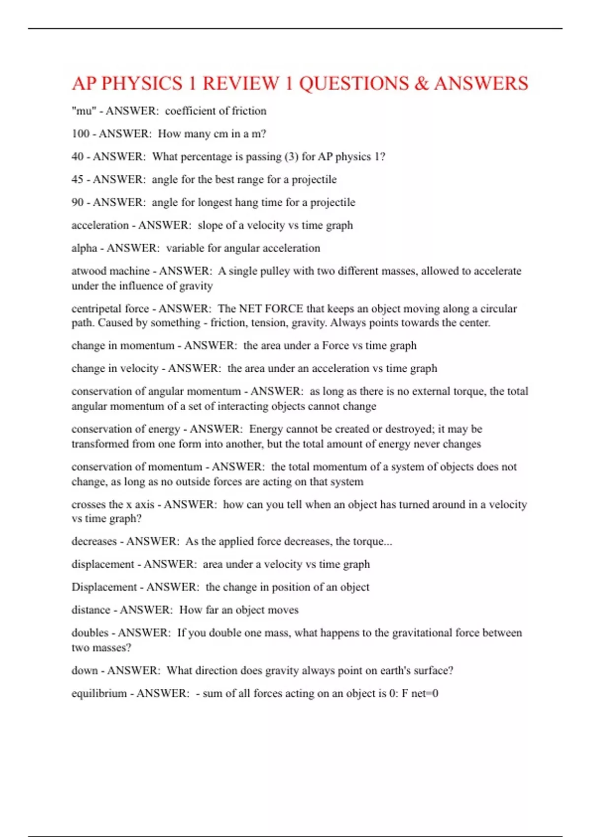AP PHYSICS 1 REVIEW 1 QUESTIONS & ANSWERS "mu" - ANSWER: coefficient of friction 100 - ANSWER: How many cm in a m? 40 - ANSWER: What percentage is passing (3) for AP physics 1? 45 - ANSWER: angle for the best range for a projectile 90 - ANSWER: angle for longest hang time for a projectile acceleration - ANSWER: slope of a velocity vs time graph alpha - ANSWER: variable for angular acceleration atwood machine - ANSWER: A single pulley with two different masses, allowed to accelerate under the influence of gravity centripetal force - ANSWER: The NET FORCE that keeps an object moving along a circular path. Caused by something - friction, tension, gravity. Always points towards the center. change in momentum - ANSWER: the area under a Force vs time graph change in velocity - ANSWER: the area under an acceleration vs time graph conservation of angular momentum - ANSWER: as long as there is no external torque, the total angular momentum of a set of interacting objects cannot change conservation of energy - ANSWER: Energy cannot be created or destroyed; it may be transformed from one form into another, but the total amount of energy never changes conservation of momentum - ANSWER: the total momentum of a system of objects does not change, as long as no outside forces are acting on that system crosses the x axis - ANSWER: how can you tell when an object has turned around in a velocity vs time graph? decreases - ANSWER: As the applied force decreases, the torque... displacement - ANSWER: area under a velocity vs time graph Displacement - ANSWER: the change in position of an object distance - ANSWER: How far an object moves doubles - ANSWER: If you double one mass, what happens to the gravitational force between two masses? down - ANSWER: What direction does gravity always point on earth's surface? equilibrium - ANSWER: - sum of all forces acting on an object is 0: F net=0