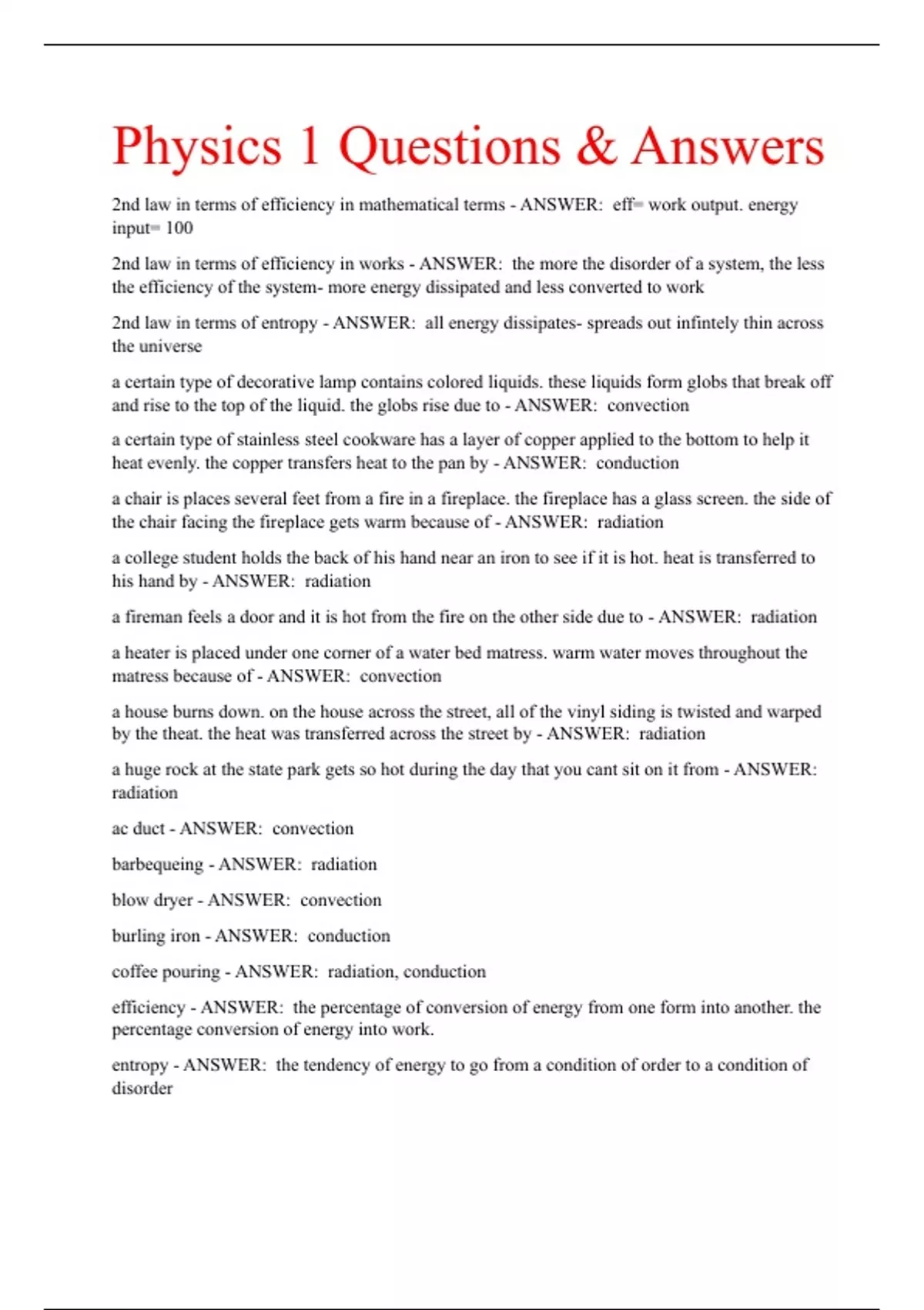 Physics 1 Questions & Answers 2nd law in terms of efficiency in mathematical terms - ANSWER: eff= work output. energy input= 100 2nd law in terms of efficiency in works - ANSWER: the more the disorder of a system, the less the efficiency of the system- more energy dissipated and less converted to work 2nd law in terms of entropy - ANSWER: all energy dissipates- spreads out infintely thin across the universe a certain type of decorative lamp contains colored liquids. these liquids form globs that break off and rise to the top of the liquid. the globs rise due to - ANSWER: convection a certain type of stainless steel cookware has a layer of copper applied to the bottom to help it heat evenly. the copper transfers heat to the pan by - ANSWER: conduction a chair is places several feet from a fire in a fireplace. the fireplace has a glass screen. the side of the chair facing the fireplace gets warm because of - ANSWER: radiation a college student holds the back of his hand near an iron to see if it is hot. heat is transferred to his hand by - ANSWER: radiation a fireman feels a door and it is hot from the fire on the other side due to - ANSWER: radiation a heater is placed under one corner of a water bed matress. warm water moves throughout the matress because of - ANSWER: convection a house burns down. on the house across the street, all of the vinyl siding is twisted and warped by the theat. the heat was transferred across the street by - ANSWER: radiation a huge rock at the state park gets so hot during the day that you cant sit on it from - ANSWER: radiation
