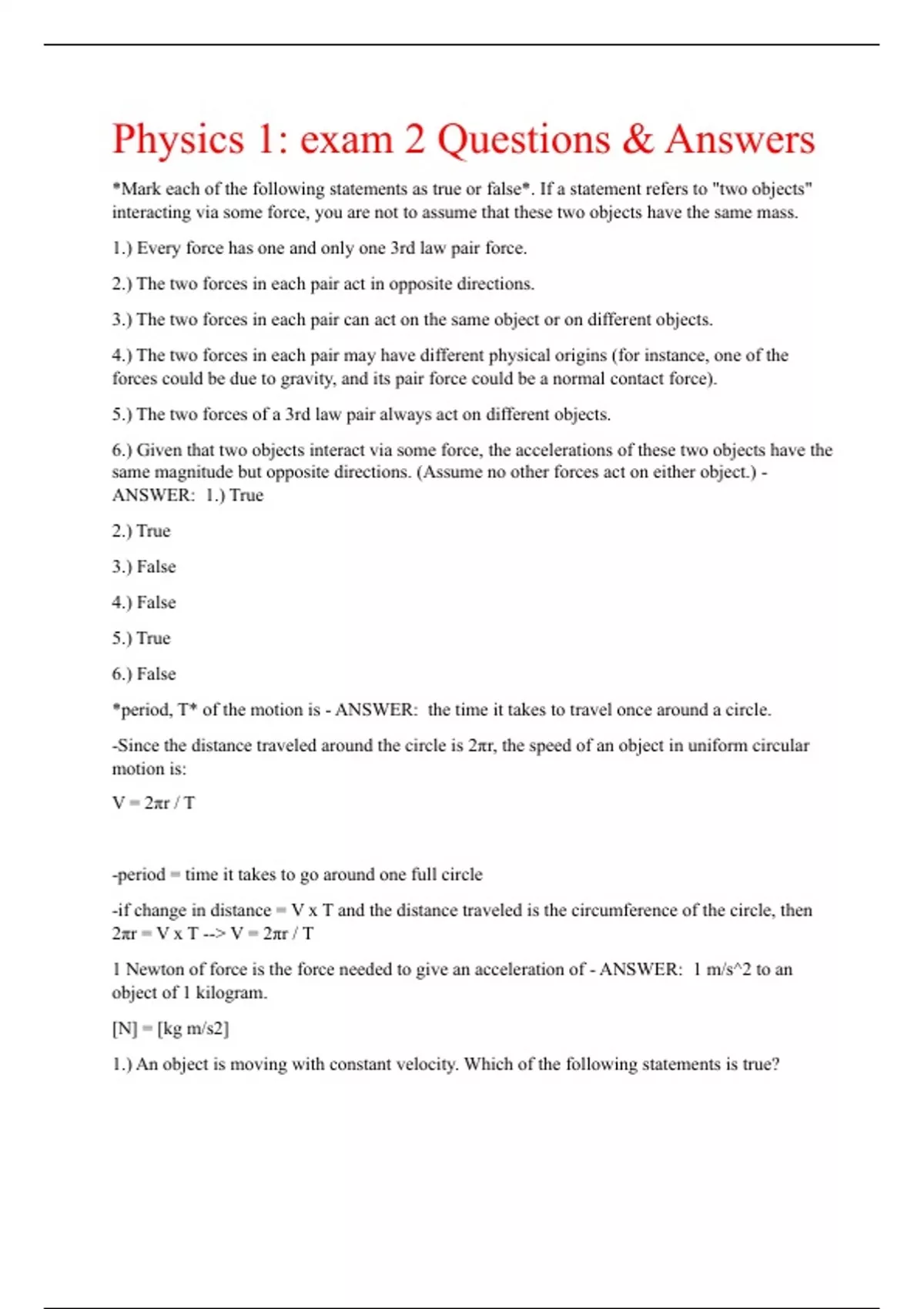 Physics 1: exam 2 Questions & Answers *Mark each of the following statements as true or false*. If a statement refers to "two objects" interacting via some force, you are not to assume that these two objects have the same mass. 1.) Every force has one and only one 3rd law pair force. 2.) The two forces in each pair act in opposite directions. 3.) The two forces in each pair can act on the same object or on different objects. 4.) The two forces in each pair may have different physical origins (for instance, one of the forces could be due to gravity, and its pair force could be a normal contact force). 5.) The two forces of a 3rd law pair always act on different objects. 6.) Given that two objects interact via some force, the accelerations of these two objects have the same magnitude but opposite directions. (Assume no other forces act on either object.) - ANSWER: 1.) True 2.) True 3.) False 4.) False 5.) True 6.) False *period, T* of the motion is - ANSWER: the time it takes to travel once around a circle. -Since the distance traveled around the circle is 2πr, the speed of an object in uniform circular motion is: V = 2πr / T -period = time it takes to go around one full circle -if change in distance = V x T and the distance traveled is the circumference of the circle, then 2πr = V x T --> V = 2πr / T 1 Newton of force is the force needed to give an acceleration of - ANSWER: 1 m/s^2 to an object of 1 kilogram. [N] = [kg m/s2] 1.) An object is moving with constant velocity. Which of the following statements is true? A) There are no forces acting on the object. B) There is no frictional force acting on the object. C) A constant force is being applied in the direction of motion. D) A constant force is being applied in the direction opposite of motion. E) The net force on the object is zero. - ANSWER: E.) The net force on the object is zero. -no acceleration 10.) A 40.0-kg crate is being raised by means of a rope. Its upward acceleration is 2.00 m/s2. What is the force exerted by the rope on the crate? - ANSWER: *A* 472 N force = tension W = 40 x 9.8 F = ma T-W T = ma + W 11.) A 40.0-kg suitcase is being pulled along the ground by means of a strap which exerts a force of 10.0 N at an angle of 43.0° above the horizontal. What is the normal force exerted by the ground? - ANSWER: Fy = 10sin40 --> Fy = 6.43 Fy and N are upward forces weight is a downward force so.... N + Fy = W W = mg --> W = 392 N = 392 - 6.43 --> *N = 385* *B* 12.) T/F: The force of static friction between two surfaces is independent of the area of contact between the surfaces. - ANSWER: *True* -fs = μsN -N = weight with no other forces present 13.) A packing crate slides down an inclined ramp at constant velocity. Thus we can deduce that - ANSWER: -no net upward force -no downward force (no acceleration) -friction force acting