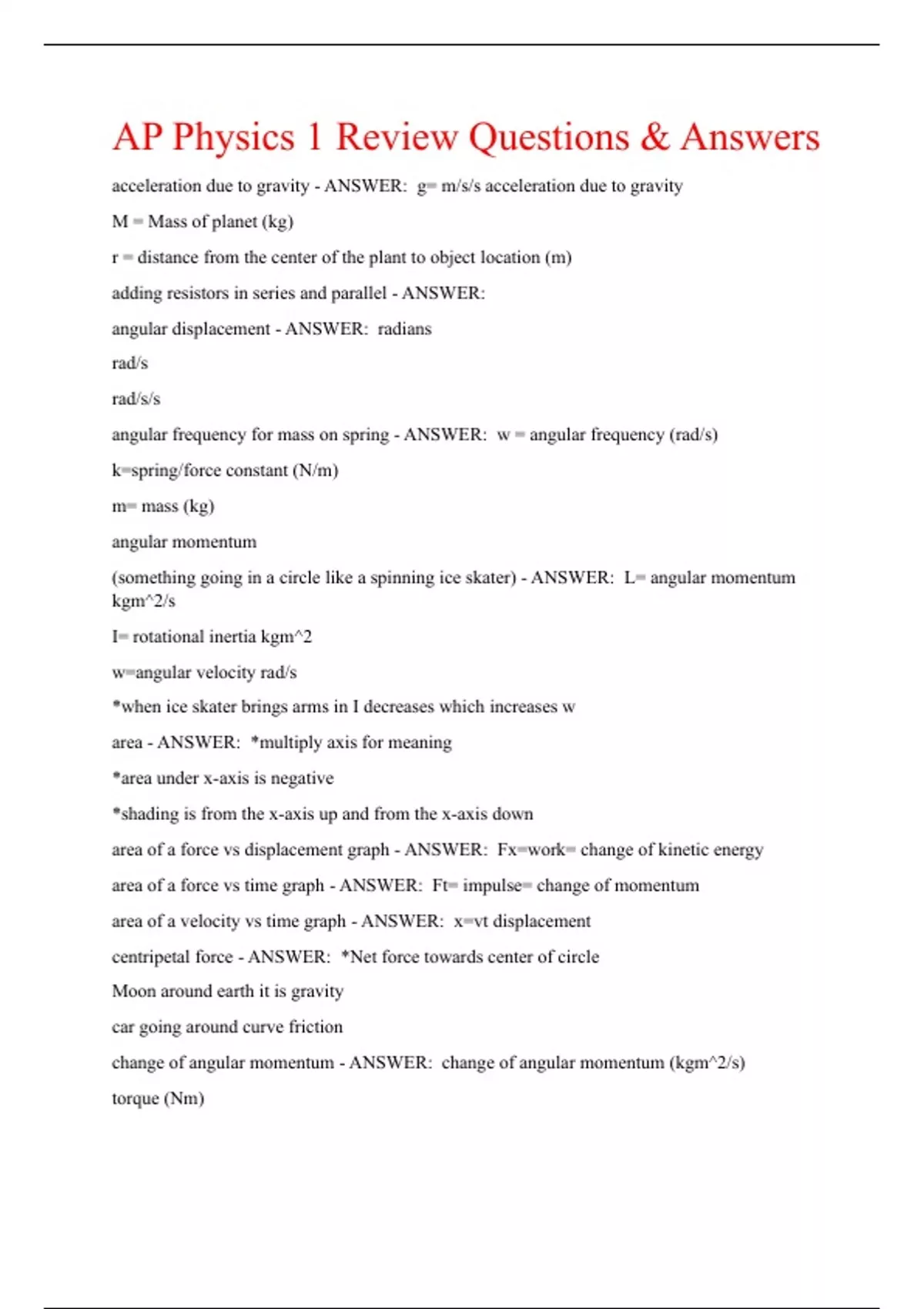 AP Physics 1 Review Questions & Answers acceleration due to gravity - ANSWER: g= m/s/s acceleration due to gravity M = Mass of planet (kg) r = distance from the center of the plant to object location (m) adding resistors in series and parallel - ANSWER: angular displacement - ANSWER: radians rad/s rad/s/s angular frequency for mass on spring - ANSWER: w = angular frequency (rad/s) k=spring/force constant (N/m) m= mass (kg) angular momentum (something going in a circle like a spinning ice skater) - ANSWER: L= angular momentum kgm^2/s I= rotational inertia kgm^2 w=angular velocity rad/s *when ice skater brings arms in I decreases which increases w area - ANSWER: *multiply axis for meaning *area under x-axis is negative *shading is from the x-axis up and from the x-axis down area of a force vs displacement graph - ANSWER: Fx=work= change of kinetic energy area of a force vs time graph - ANSWER: Ft= impulse= change of momentum area of a velocity vs time graph - ANSWER: x=vt displacement centripetal force - ANSWER: *Net force towards center of circle Moon around earth it is gravity car going around curve friction change of angular momentum - ANSWER: change of angular momentum (kgm^2/s) torque (Nm)