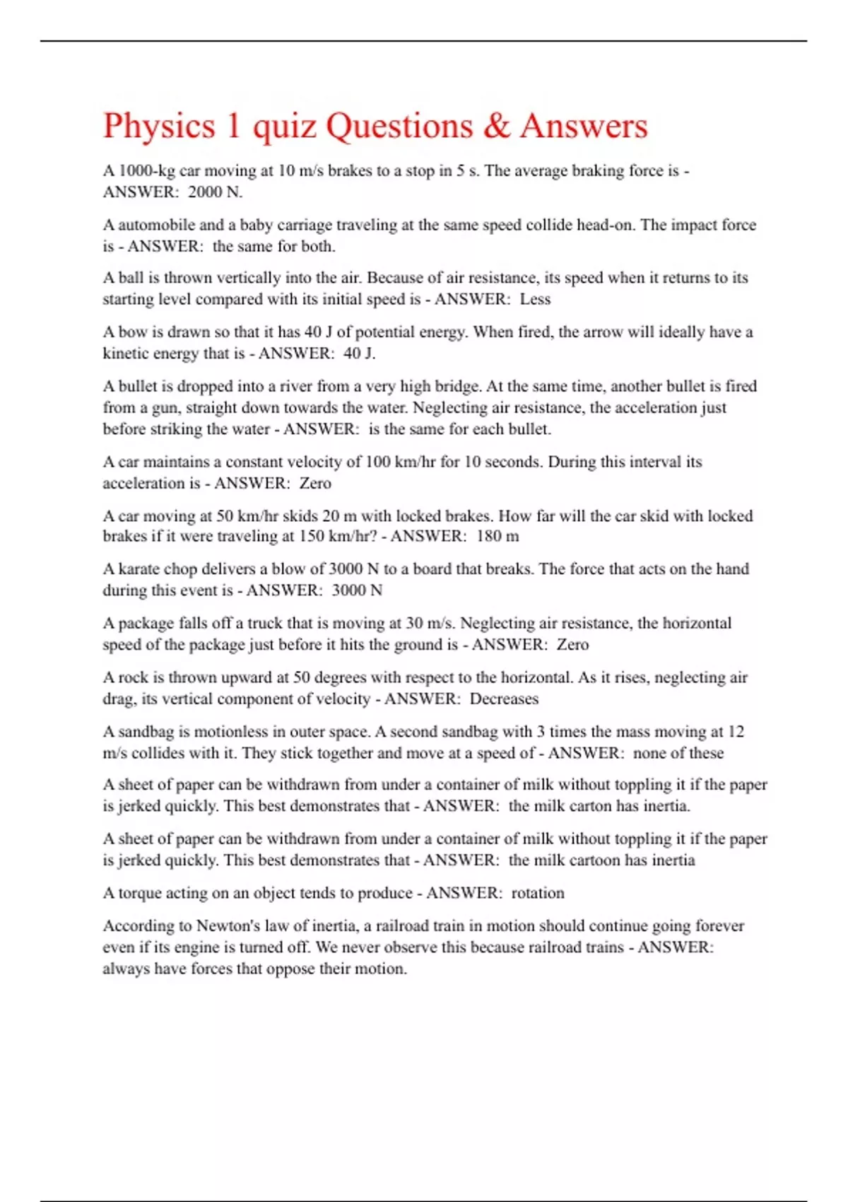 Physics 1 quiz 1 Questions & Answers addition of vectors - ANSWER: Draw vectors tip-to-tail, use scale drawing to find displacement and angle average acceleration - ANSWER: average speed - ANSWER: average velocity - ANSWER: centi (c) - ANSWER: components of a vector - ANSWER: the projections of a vector along the axes of a coordinate system cos formula - ANSWER: adjacent/hypotenuse deci (d) - ANSWER: Dimensional Analysis rules - ANSWER: added and subtracted only if they have the same dimensions Displacement - ANSWER: the moving of something from its place or position. distance - ANSWER: How far an object moves SI Unit: m division of vector by scalar quantity - ANSWER: the magnitude of the vector decreases by the scalar quantity it is divided by giga (G) - ANSWER: instantaneous acceleration - ANSWER: kilo (k) - ANSWER: magnitude - ANSWER: amount of distance magnitude formula - ANSWER: mega (M) - ANSWER:
