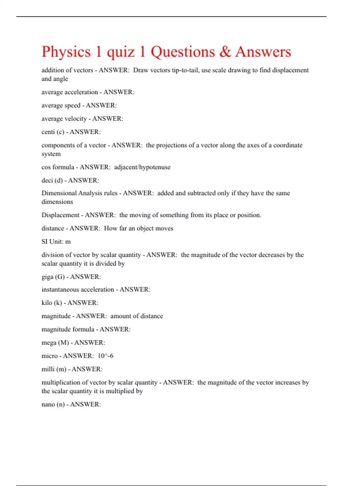 Physics 1 quiz 1 Questions & Answers addition of vectors - ANSWER: Draw vectors tip-to-tail, use scale drawing to find displacement and angle average acceleration - ANSWER: average speed - ANSWER: average velocity - ANSWER: centi (c) - ANSWER: components of a vector - ANSWER: the projections of a vector along the axes of a coordinate system cos formula - ANSWER: adjacent/hypotenuse deci (d) - ANSWER: Dimensional Analysis rules - ANSWER: added and subtracted only if they have the same dimensions Displacement - ANSWER: the moving of something from its place or position. distance - ANSWER: How far an object moves SI Unit: m division of vector by scalar quantity - ANSWER: the magnitude of the vector decreases by the scalar quantity it is divided by giga (G) - ANSWER: instantaneous acceleration - ANSWER: kilo (k) - ANSWER: magnitude - ANSWER: amount of distance magnitude formula - ANSWER: mega (M) - ANSWER: micro - ANSWER: 10^-6