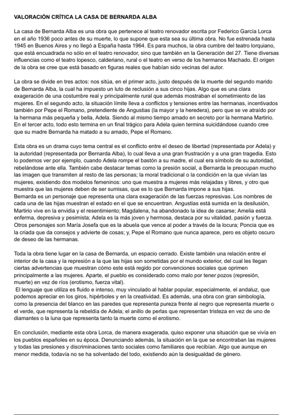 Esta valoración crítica pertenece al teatro de Federico García Lorca. Puede ser usado para la EVAU perteneciendo a la etapa anterior de 1936