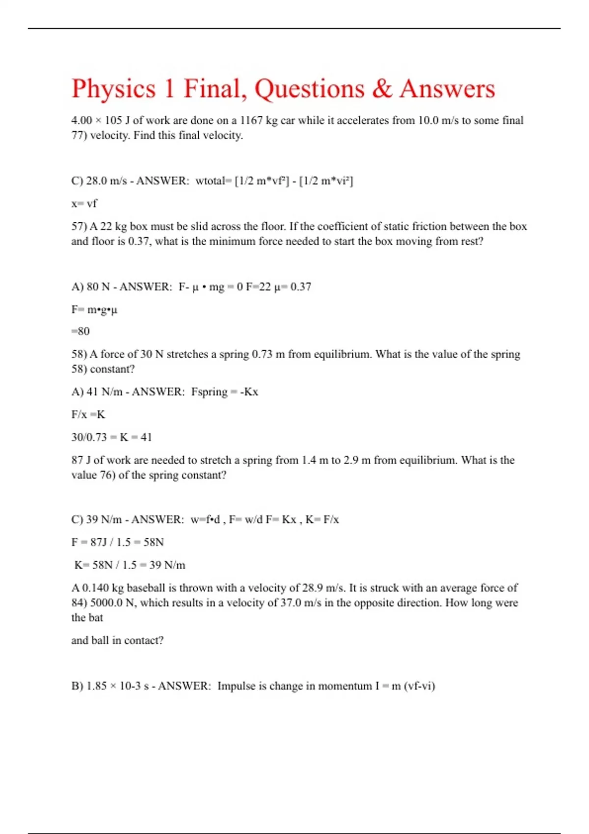Physics 1 Final, Questions & Answers 4.00 × 105 J of work are done on a 1167 kg car while it accelerates from 10.0 m/s to some final 77) velocity. Find this final velocity. C) 28.0 m/s - ANSWER: wtotal= [1/2 m*vf²] - [1/2 m*vi²] x= vf 57) A 22 kg box must be slid across the floor. If the coefficient of static friction between the box and floor is 0.37, what is the minimum force needed to start the box moving from rest? A) 80 N - ANSWER: F- µ • mg = 0 F=22 µ= 0.37 F= m•g•µ =80 58) A force of 30 N stretches a spring 0.73 m from equilibrium. What is the value of the spring 58) constant? A) 41 N/m - ANSWER: Fspring = -Kx F/x =K 30/0.73 = K = 41 87 J of work are needed to stretch a spring from 1.4 m to 2.9 m from equilibrium. What is the value 76) of the spring constant? C) 39 N/m - ANSWER: w=f•d , F= w/d F= Kx , K= F/x F = 87J / 1.5 = 58N K= 58N / 1.5 = 39 N/m A 0.140 kg baseball is thrown with a velocity of 28.9 m/s. It is struck with an average force of 84) 5000.0 N, which results in a velocity of 37.0 m/s in the opposite direction. How long were the bat and ball in contact? B) 1.85 × 10-3 s - ANSWER: Impulse is change in momentum I = m (vf-vi) T = m ( - vf - vi ) / F = 1.85 X 10^-3 (in miliseconds) A 0.16 kg block on a horizontal frictionless surface is attached to a spring whose force constant is 16) 360 N/m. The block is pulled from its equilibrium position at x = 0 m to a displacement x = +0.080 m and is released from rest. The block then executes simple harmonic motion along the x-axis (horizontal). When the displacement is x = -0.037 m, the acceleration of the block is closest to: A) 85 m/s2 - ANSWER: ma= -kx so, a= -kx/m m=0.16 kg, x= -0.037, k= 360 [ -360 (-0.037) ] / 0.16kg = 84 m/s^2 A 0.39 kg block on a horizontal frictionless surface is attached to a spring whose force constant is 15) 570 N/m. The block is pulled from its equilibri