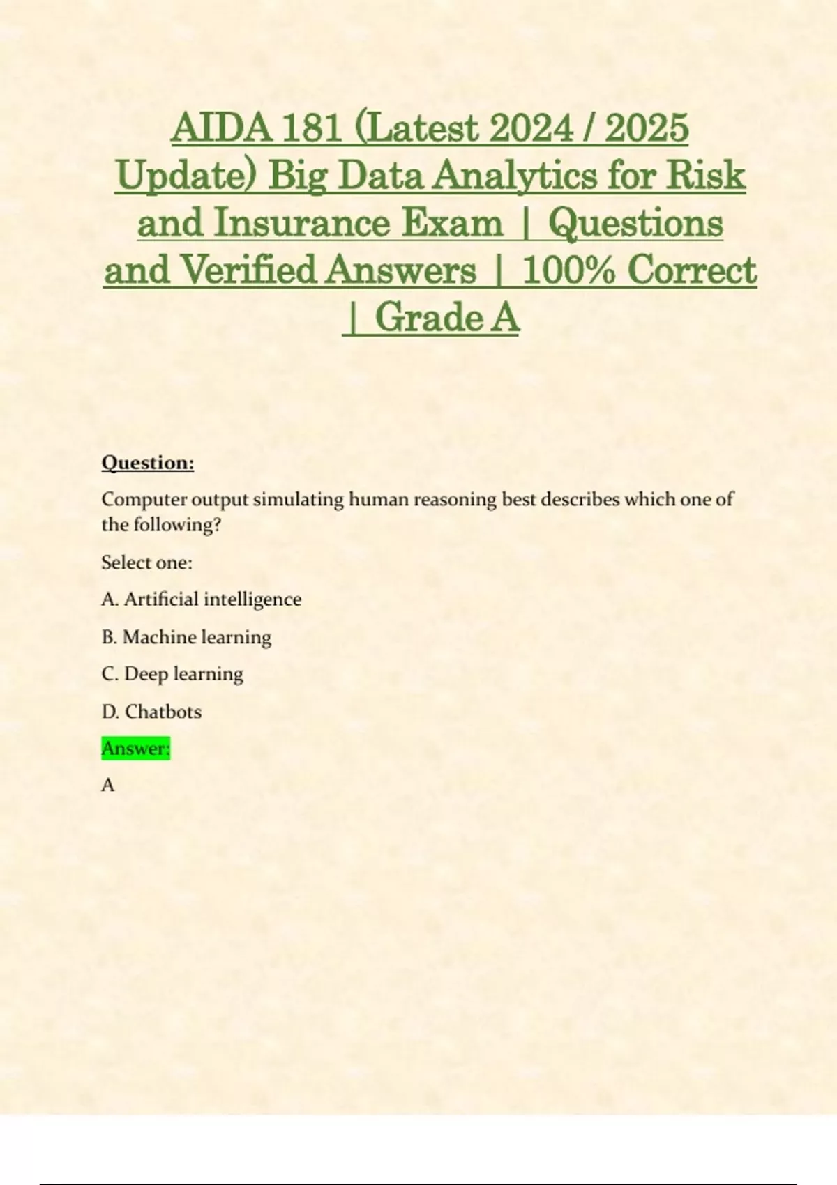 AIDA 181 (Latest 2024 / 2025 Update) Big Data Analytics for Risk and Insurance Exam | Questions and Verified Answers | 100% Correct | Grade A Question: Computer output simulating human reasoning best describes which one of the following? Select one: A. Artificial intelligence B. Machine learning C. Deep learning D. Chatbots Answer: A Question: Annette is a claims adjuster with Midwestern Insurance (MI). MI recently invested in and established robotic process automation (RPA) in many of its routine repetitive tasks in its claims department. Annette is discovering that her role may be changing in which one of the following ways? Select one: A. Annette will assume responsibility for claims that call for empathy to meet the emotional needs of insureds and claims. B. MI has decided the large-scale process reengineering effort is worth it so Annette can have more customer-facing opportunities. C. Annette's potential for human fallibility, and therefore MI's operational risk, is heightened by the effects of RPA systems. D. Annette still does most of these same tasks as MI has discovered she does them less expensively. Answer: A Question: Which one of the following statements is true regarding smart operations? Select one: A. Smart operations are very gradually making their way into the field of risk management. B. Applying algorithms to big data generates the information underlying smart operations. C. The preventive analytics that lie at the heart of smart operations are based on historical data. D. Smart operations are limited by the amount of data that they can gather and process. Answer: B Question: Which one of the following emerging technologies has led to major advances in the field of automotive safety and the development of automated vehicles? Select one: A. Artificial intelligence B. Wireless sensor networks C. Computer vision D. Drones Answer: C Question: Which one of the following is particularly useful in vacant or temporarily unoccupied buildings? Select one: A. Temperature sensors B. Motion sensors C. Power consumption sensors D. Light sensors Answer: A Question: Personal lines insurers are investigating ways to incorporate discounts for homeowners insurance policies based on homeowners' use of which one of the following? Select one: A. Smart home devices B. Loss ratios C. Classification analysis D. Predictive modeling Answer: A Question: Three Hills Insurance (THI) is a regional insurer. The profitability of its homeowners book has been declining for several years. In the past, THI has been able to maintain profitability by using traditional rating variables and implementing flat rate increases across the entire book when necessary. It has been suggested that THI use machine learning to segment its homeowners book. Based on its relatively small size, management does not believe that it has sufficient data available to benefit from machine learning. Which one of the following is a valuable source of data, not used in traditional methods, that could be made available to THI through machine learning? A. Account loss ratios B. Customer credit ratings C. Producers' and claim representatives' files D. Policyholder applications Answer: C Question: Which one of the following is artificial intelligence in which computers continually teach themselves to make better decisions based on previous results and new data? Select one: A. Usage-based insurance B. Telematics C. Machine learning D. Generalized linear model Answer: C Question: Park Slope Baking recently began manufacturing a line of gluten-free products. Caroline is the products liability underwriter for the account and is not sure how concerned she should be about the new product line. She knows that gluten-free products have become more popular recently, but she does not know if there have been any products liability problems. Which one of the following is an appropriate technique that data scientists can use to help Caroline discover emerging risks with gluten-free products? Select one: A. Cluster analysis B. Classification tree C. Telematics D. Predictive modeling Answer: A