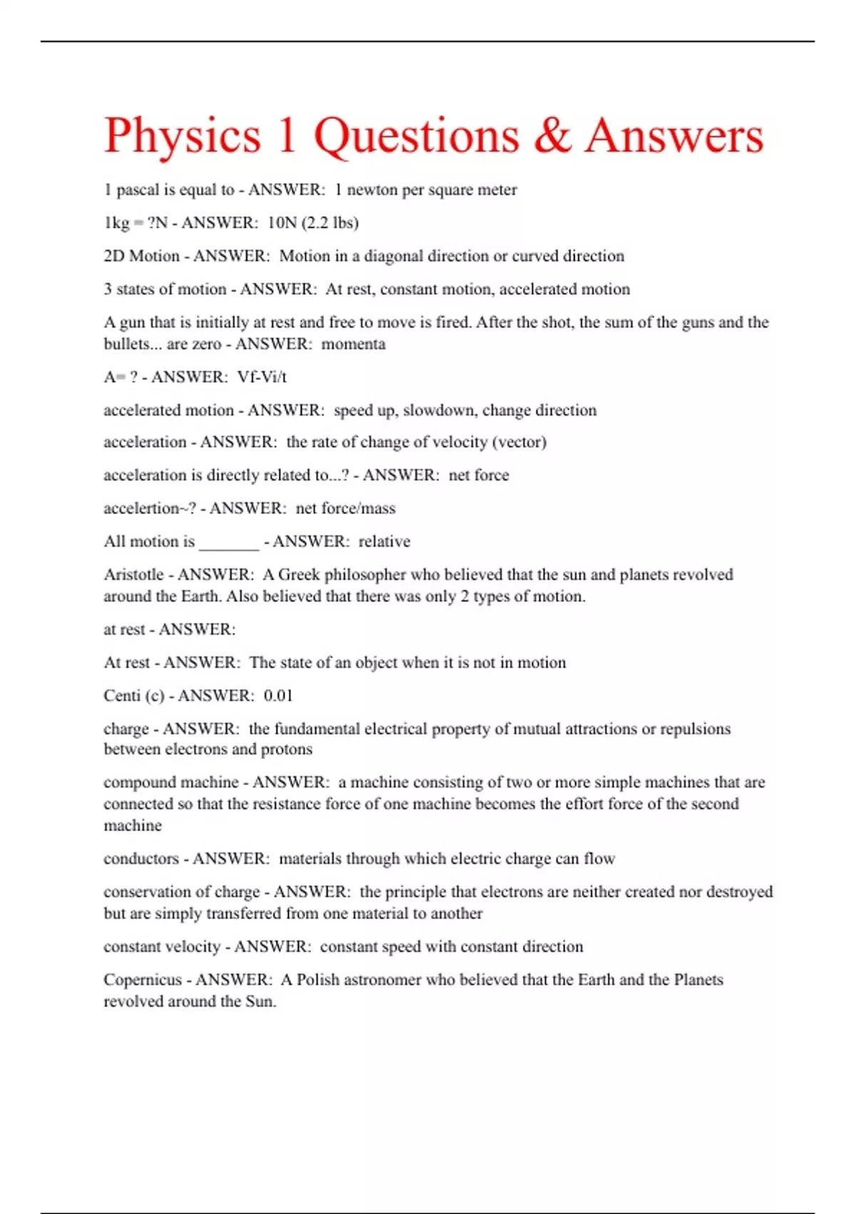 Physics 1 Questions & Answers 1 pascal is equal to - ANSWER: 1 newton per square meter 1kg = ?N - ANSWER: 10N (2.2 lbs) 2D Motion - ANSWER: Motion in a diagonal direction or curved direction 3 states of motion - ANSWER: At rest, constant motion, accelerated motion A gun that is initially at rest and free to move is fired. After the shot, the sum of the guns and the bullets... are zero - ANSWER: momenta A= ? - ANSWER: Vf-Vi/t accelerated motion - ANSWER: speed up, slowdown, change direction acceleration - ANSWER: the rate of change of velocity (vector) acceleration is directly related to...? - ANSWER: net force accelertion~? - ANSWER: net force/mass All motion is _______ - ANSWER: relative Aristotle - ANSWER: A Greek philosopher who believed that the sun and planets revolved around the Earth. Also believed that there was only 2 types of motion. at rest - ANSWER: At rest - ANSWER: The state of an object when it is not in motion Centi (c) - ANSWER: 0.01 charge - ANSWER: the fundamental electrical property of mutual attractions or repulsions between electrons and protons compound machine - ANSWER: a machine consisting of two or more simple machines that are connected so that the resistance force of one machine becomes the effort force of the second machine conductors - ANSWER: materials through which electric charge can flow conservation of charge - ANSWER: the principle that electrons are neither created nor destroyed but are simply transferred from one material to another constant velocity - ANSWER: constant speed with constant direction Copernicus - ANSWER: A Polish astronomer who believed that the Earth and the Planets revolved around the Sun.