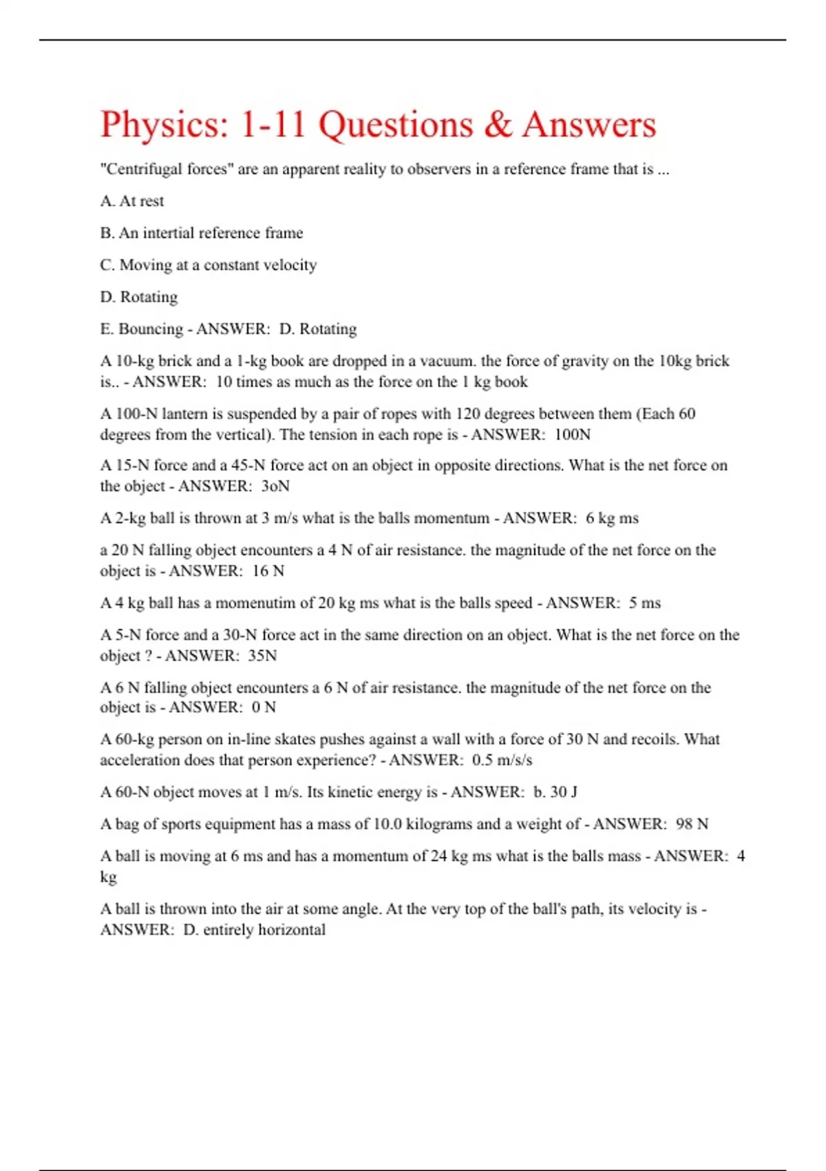 Physics: 1-11 Questions & Answers "Centrifugal forces" are an apparent reality to observers in a reference frame that is ... A. At rest B. An intertial reference frame C. Moving at a constant velocity D. Rotating E. Bouncing - ANSWER: D. Rotating A 10-kg brick and a 1-kg book are dropped in a vacuum. the force of gravity on the 10kg brick is.. - ANSWER: 10 times as much as the force on the 1 kg book A 100-N lantern is suspended by a pair of ropes with 120 degrees between them (Each 60 degrees from the vertical). The tension in each rope is - ANSWER: 100N A 15-N force and a 45-N force act on an object in opposite directions. What is the net force on the object - ANSWER: 3oN A 2-kg ball is thrown at 3 m/s what is the balls momentum - ANSWER: 6 kg ms a 20 N falling object encounters a 4 N of air resistance. the magnitude of the net force on the object is - ANSWER: 16 N A 4 kg ball has a momenutim of 20 kg ms what is the balls speed - ANSWER: 5 ms A 5-N force and a 30-N force act in the same direction on an object. What is the net force on the object ? - ANSWER: 35N A 6 N falling object encounters a 6 N of air resistance. the magnitude of the net force on the object is - ANSWER: 0 N A 60-kg person on in-line skates pushes against a wall with a force of 30 N and recoils. What acceleration does that person experience? - ANSWER: 0.5 m/s/s A 60-N object moves at 1 m/s. Its kinetic energy is - ANSWER: b. 30 J A bag of sports equipment has a mass of 10.0 kilograms and a weight of - ANSWER: 98 N A ball is moving at 6 ms and has a momentum of 24 kg ms what is the balls mass - ANSWER: 4 kg A ball is thrown into the air at some angle. At the very top of the ball's path, its velocity is - ANSWER: D. entirely horizontal A ball is thrown into the air with 100 J of kinetic energy which is transformed to gravitational potential energy at the top of its trajectory. When it returns to its original level after encountering air resistance, its kinetic energy is - ANSWER: c. less than 100 J A ball is thrown straight up. At the top of its path its acceleration is - ANSWER: about 10 m/s squared A ball is thrown straight up. At the top of its path its instantaneous speed is - ANSWER: 0 m/s A ball is thrown straight upward a 10 m/s. Ideally (no air resistance), the ball will return to the thrower's hand with a speed of - ANSWER: C. 10 m/s