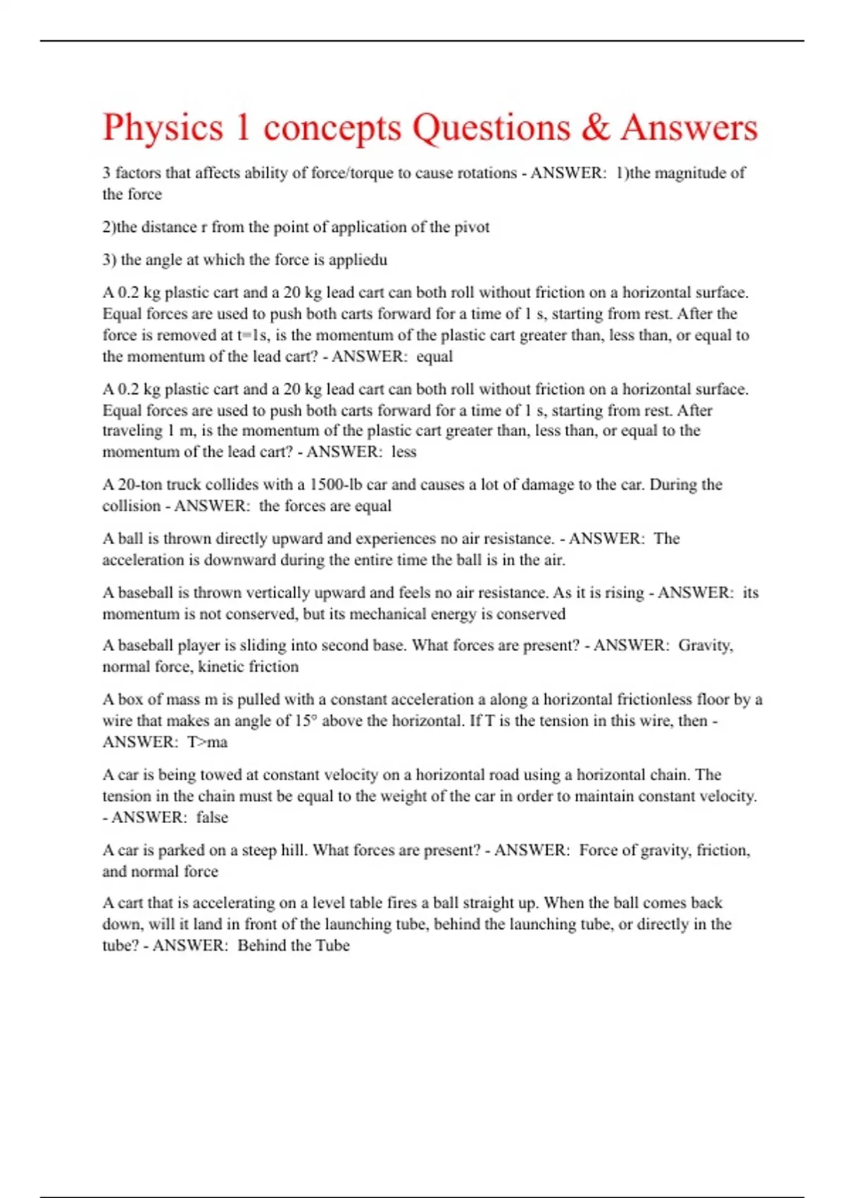 Physics 1 concepts Questions & Answers 3 factors that affects ability of force/torque to cause rotations - ANSWER: 1)the magnitude of the force 2)the distance r from the point of application of the pivot 3) the angle at which the force is appliedu A 0.2 kg plastic cart and a 20 kg lead cart can both roll without friction on a horizontal surface. Equal forces are used to push both carts forward for a time of 1 s, starting from rest. After the force is removed at t=1s, is the momentum of the plastic cart greater than, less than, or equal to the momentum of the lead cart? - ANSWER: equal A 0.2 kg plastic cart and a 20 kg lead cart can both roll without friction on a horizontal surface. Equal forces are used to push both carts forward for a time of 1 s, starting from rest. After traveling 1 m, is the momentum of the plastic cart greater than, less than, or equal to the momentum of the lead cart? - ANSWER: less A 20-ton truck collides with a 1500-lb car and causes a lot of damage to the car. During the collision - ANSWER: the forces are equal A ball is thrown directly upward and experiences no air resistance. - ANSWER: The acceleration is downward during the entire time the ball is in the air. A baseball is thrown vertically upward and feels no air resistance. As it is rising - ANSWER: its momentum is not conserved, but its mechanical energy is conserved A baseball player is sliding into second base. What forces are present? - ANSWER: Gravity, normal force, kinetic friction A box of mass m is pulled with a constant acceleration a along a horizontal frictionless floor by a wire that makes an angle of 15° above the horizontal. If T is the tension in this wire, then - ANSWER: T>ma A car is being towed at constant velocity on a horizontal road using a horizontal chain. The tension in the chain must be equal to the weight of the car in order to maintain constant velocity. - ANSWER: false A car is parked on a steep hill. What forces are present? - ANSWER: Force of gravity, friction, and normal force A cart that is accelerating on a level table fires a ball straight up. When the ball comes back down, will it land in front of the launching tube, behind the launching tube, or directly in the tube? - ANSWER: Behind the Tube