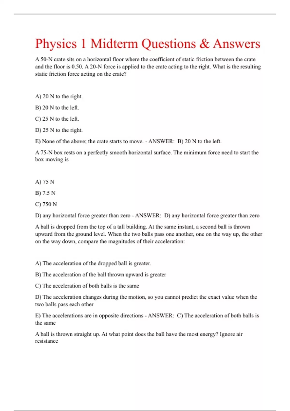 Physics 1 Midterm Questions & Answers A 50-N crate sits on a horizontal floor where the coefficient of static friction between the crate and the floor is 0.50. A 20-N force is applied to the crate acting to the right. What is the resulting static friction force acting on the crate? A) 20 N to the right. B) 20 N to the left. C) 25 N to the left. D) 25 N to the right. E) None of the above; the crate starts to move. - ANSWER: B) 20 N to the left. A 75-N box rests on a perfectly smooth horizontal surface. The minimum force need to start the box moving is A) 75 N B) 7.5 N C) 750 N D) any horizontal force greater than zero - ANSWER: D) any horizontal force greater than zero A ball is dropped from the top of a tall building. At the same instant, a second ball is thrown upward from the ground level. When the two balls pass one another, one on the way up, the other on the way down, compare the magnitudes of their acceleration: A) The acceleration of the dropped ball is greater. B) The acceleration of the ball thrown upward is greater C) The acceleration of both balls is the same D) The acceleration changes during the motion, so you cannot predict the exact value when the two balls pass each other E) The accelerations are in opposite directions - ANSWER: C) The acceleration of both balls is the same A ball is thrown straight up. At what point does the ball have the most energy? Ignore air resistance