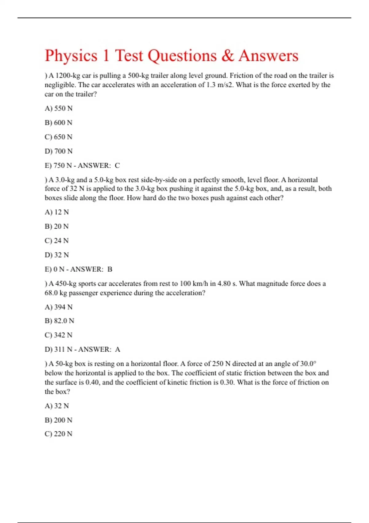 Physics 1 Test Questions & Answers ) A 1200-kg car is pulling a 500-kg trailer along level ground. Friction of the road on the trailer is negligible. The car accelerates with an acceleration of 1.3 m/s2. What is the force exerted by the car on the trailer? A) 550 N B) 600 N C) 650 N D) 700 N E) 750 N - ANSWER: C ) A 3.0-kg and a 5.0-kg box rest side-by-side on a perfectly smooth, level floor. A horizontal force of 32 N is applied to the 3.0-kg box pushing it against the 5.0-kg box, and, as a result, both boxes slide along the floor. How hard do the two boxes push against each other? A) 12 N B) 20 N C) 24 N D) 32 N E) 0 N - ANSWER: B ) A 450-kg sports car accelerates from rest to 100 km/h in 4.80 s. What magnitude force does a 68.0 kg passenger experience during the acceleration? A) 394 N B) 82.0 N C) 342 N D) 311 N - ANSWER: A ) A 50-kg box is resting on a horizontal floor. A force of 250 N directed at an angle of 30.0° below the horizontal is applied to the box. The coefficient of static friction between the box and the surface is 0.40, and the coefficient of kinetic friction is 0.30. What is the force of friction on the box? A) 32 N B) 200 N C) 220 N D) 250 N E) 620 N - ANSWER: C ) A 6.0-kg box slides down an inclined plane that makes an angle of 39° with the horizontal. If the coefficient of kinetic friction is 0.40, at what rate does the box accelerate down the slope? A) 3.1 m/s2 B) 3.4 m/s2 C) 3.7 m/s2 D) 4.1 m/s2 - ANSWER: A ) A ball is thrown horizontally from the top of a tower at the same instant that a stone is dropped vertically. Which object is traveling faster when it hits the level ground below if neither of them experiences any air resistance? A) It is impossible to tell because we do not know their masses. B) the stone C) the ball D) Both are traveling at the same speed. - ANSWER: C ) A child is trying to throw a ball over a fence. She gives the ball an initial speed of 8.0 m/s at an angle of 40° above the horizontal. The ball leaves her hand 1.0 m above the ground and the fence is 2.0 m high. The ball just clears the fence while still traveling upwards and experiences no significant air resistance. How far is the child from the fence? A) 0.73 m B) 1.6 m C) 2.7 m D) 3.8 m E) 7.5 m - ANSWER: B ) A flatbed truck is carrying a 20-kg crate up a sloping road. The coefficient of static friction between the crate and the bed is 0.40, and the coefficient of kinetic friction is 0.30. What is the maximum angle of slope that the truck can climb at constant speed if the crate is to stay in place? A) 0.38° B) 13° C) 17° D) 22° E) 68° - ANSWER: D ) A hockey puck slides off the edge of a platform with an initial velocity of 20 m/s horizontally. The height of the platform above the ground is 2.0 m. What is the magnitude of the velocity of the puck just before it touches the ground? You can neglect air resistance. A) 21 m/s B) 22 m/s C) 24 m/s D) 25 m/s E) 6.3 m/s - ANSWER: A ) A jet plane is launched from a catapult on an aircraft carrier. In 2.0 s it reaches a speed of 42 m/s at the end of the catapult. Assuming the acceleration is constant, how far did it travel during those 2.0 s? A) 16 m B) 24 m C) 42 m D) 84 m - ANSWER: C ) A laser is thrown upward with a speed of 12 m/s on the surface of planet X where the acceleration due to gravity is 1.5 m/s2 and there is no atmosphere. How long does it take for the laser to reach the maximum height? A) 8.0 s B) 11 s C) 14 s D) 16 s - ANSWER: A ) A load is being lifted vertically upwards by means of two cables attached to it. The first cable exerts a force of 600 N at an angle of 35.0° to the left of the vertical. The second cable exerts a force of 1300 N. At what angle to the right of the vertical is the second cable pulling? A) 15.4° B) 16.2° C) 30.8° D) 67.8° E) 75.8° - ANSWER: A