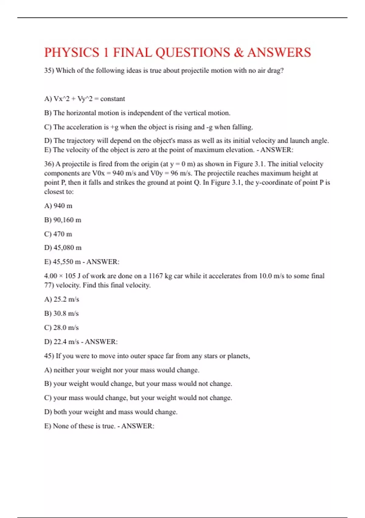 PHYSICS 1 FINAL QUESTIONS & ANSWERS 35) Which of the following ideas is true about projectile motion with no air drag? A) Vx^2 + Vy^2 = constant B) The horizontal motion is independent of the vertical motion. C) The acceleration is +g when the object is rising and -g when falling. D) The trajectory will depend on the object's mass as well as its initial velocity and launch angle. E) The velocity of the object is zero at the point of maximum elevation. - ANSWER: 36) A projectile is fired from the origin (at y = 0 m) as shown in Figure 3.1. The initial velocity components are V0x = 940 m/s and V0y = 96 m/s. The projectile reaches maximum height at point P, then it falls and strikes the ground at point Q. In Figure 3.1, the y-coordinate of point P is closest to: A) 940 m B) 90,160 m C) 470 m D) 45,080 m E) 45,550 m - ANSWER: 4.00 × 105 J of work are done on a 1167 kg car while it accelerates from 10.0 m/s to some final 77) velocity. Find this final velocity. A) 25.2 m/s B) 30.8 m/s C) 28.0 m/s D) 22.4 m/s - ANSWER: 45) If you were to move into outer space far from any stars or planets, A) neither your weight nor your mass would change. B) your weight would change, but your mass would not change. C) your mass would change, but your weight would not change. D) both your weight and mass would change. E) None of these is true. - ANSWER: 5) Beings on spherical asteroid have observed that a large rock is approaching their asteroid in a 5) collision course. At 7514 km from the center of the asteroid, the rock has a speed of 136.0 m/s and later at 2823 km it has a speed of 392.0 m/s. Use energy conservation to find the mass of asteroid . You can neglect any effects due to the parent star of the asteroid. (G = 6.67 × 10-11 N · m2/kg2) A) 6.112 × 10^28 kg B) 9.164 × 10^27 kg C) 4.582 × 10^20 kg D) 4.582 × 10^21 kg - ANSWER: 50) Two blocks, A and B, are being pulled to the right along a horizontal surface by a horizontal 100 N 50) pull, as shown in Figure 4.5. Both of them are moving together at a constant velocity of 2.0 m/s to the right, and both weigh the same. Which of the figures below shows a correct free-body diagram