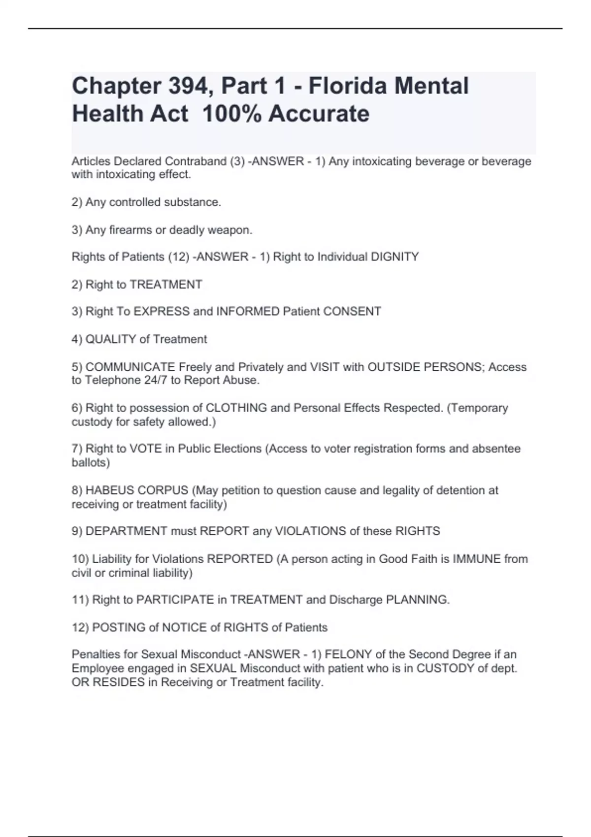Articles Declared Contraband (3) -ANSWER - 1) Any intoxicating beverage or beverage with intoxicating effect. 2) Any controlled substance. 3) Any firearms or deadly weapon. Rights of Patients (12) -ANSWER - 1) Right to Individual DIGNITY 2) Right to TREATMENT 3) Right To EXPRESS and INFORMED Patient CONSENT 4) QUALITY of Treatment 5) COMMUNICATE Freely and Privately and VISIT with OUTSIDE PERSONS; Access to Telephone 24/7 to Report Abuse. 6) Right to possession of CLOTHING and Personal Effects Respected. (Temporary custody for safety allowed.) 7) Right to VOTE in Public Elections (Access to voter registration forms and absentee ballots) 8) HABEUS CORPUS (May petition to question cause and legality of detention at receiving or treatment facility) 9) DEPARTMENT must REPORT any VIOLATIONS of these RIGHTS 10) Liability for Violations REPORTED (A person acting in Good Faith is IMMUNE from civil or criminal liability) 11) Right to PARTICIPATE in TREATMENT