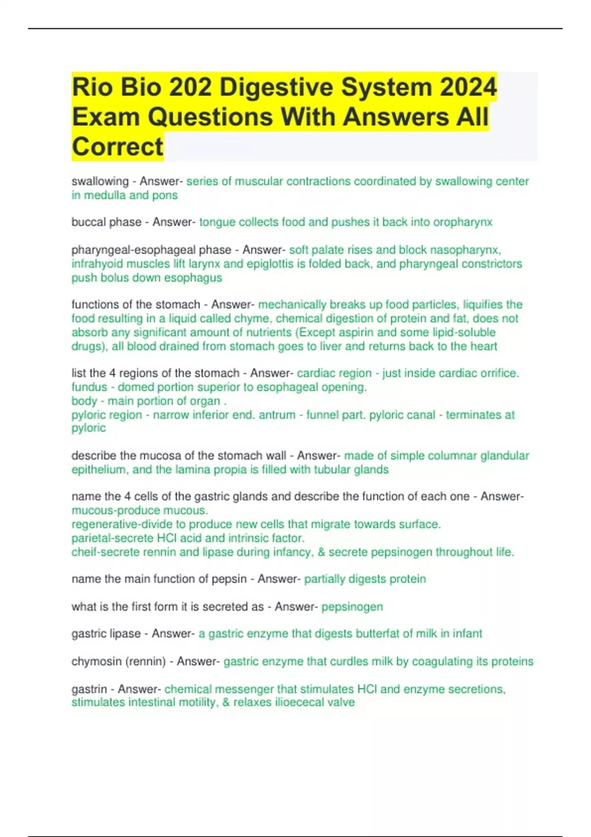 Rio Bio 202 Digestive System 2024 Exam Questions With Answers All Correct swallowing - Answer- series of muscular contractions coordinated by swallowing center in medulla and pons buccal phase - Answer- tongue collects food and pushes it back into oropharynx pharyngeal-esophageal phase - Answer- soft palate rises and block nasopharynx, infrahyoid muscles lift larynx and epiglottis is folded back, and pharyngeal constrictors push bolus down esophagus functions of the stomach - Answer- mechanically breaks up food particles, liquifies the food resulting in a liquid called chyme, chemical digestion of protein and fat, does not absorb any significant amount of nutrients (Except aspirin and some lipid-soluble drugs), all blood drained from stomach goes to liver and returns back to the heart list the 4 regions of the stomach - Answer- cardiac region - just inside cardiac orrifice. fundus - domed portion superior to esophageal opening. body - main portion of organ . pyloric region - narrow inferior end. antrum - funnel part. pyloric canal - terminates at pyloric describe the mucosa of the stomach wall - Answer- made of simple columnar glandular epithelium, and the lamina propia is filled with tubular glands name the 4 cells of the gastric glands and describe the function of each one - Answer- mucous-produce mucous. regenerative-divide to produce new cells that migrate towards surface. parietal-secrete HCl acid and intrinsic factor. cheif-secrete rennin and lipase during infancy, & secrete pepsinogen throughout life. name the main function of pepsin - Answer- partially digests protein what is the first form it is secreted as - Answer- pepsinogen gastric lipase - Answer- a gastric enzyme that digests butterfat of milk in infant chymosin (rennin) - Answer- gastric enzyme that curdles milk by coagulating its proteins gastrin - Answer- chemical messenger that stimulates HCl and enzyme secretions, stimulates intestinal motility, & relaxes ilioececal valve