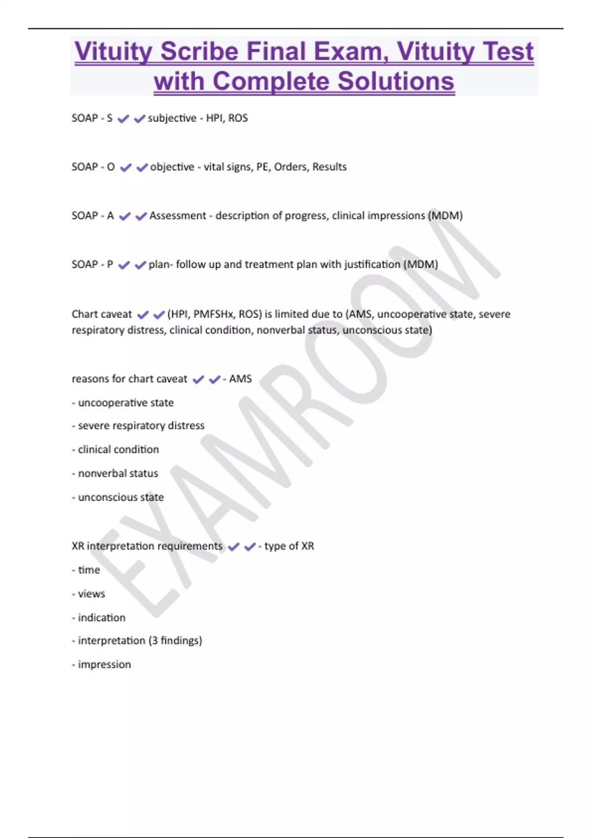 Vituity Scribe Final Exam, Vituity Test with Complete Solutions SOAP - S subjective - HPI, ROS SOAP - O objective - vital signs, PE, Orders, Results SOAP - A Assessment - description of progress, clinical impressions (MDM) SOAP - P plan- follow up and treatment plan with justification (MDM) Chart caveat (HPI, PMFSHx, ROS) is limited due to (AMS, uncooperative state, severe respiratory distress, clinical condition, nonverbal status, unconscious state) reasons for chart caveat - AMS