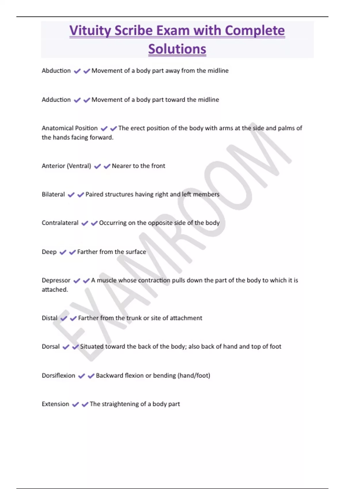 Vituity Scribe Exam with Complete Solutions Abduction Movement of a body part away from the midline Adduction Movement of a body part toward the midline Anatomical Position The erect position of the body with arms at the side and palms of the hands facing forward. Anterior (Ventral) Nearer to the front Bilateral Paired structures having right and left members Contralateral Occurring on the opposite side of the body Deep Farther from the surface