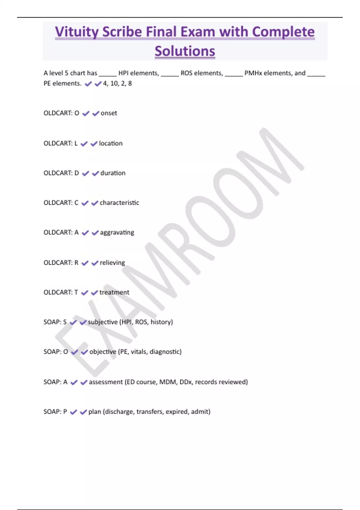 Vituity Scribe Final Exam with Complete Solutions A level 5 chart has _____ HPI elements, _____ ROS elements, _____ PMHx elements, and _____ PE elements. 4, 10, 2, 8 OLDCART: O onset OLDCART: L location OLDCART: D duration OLDCART: C characteristic OLDCART: A aggravating