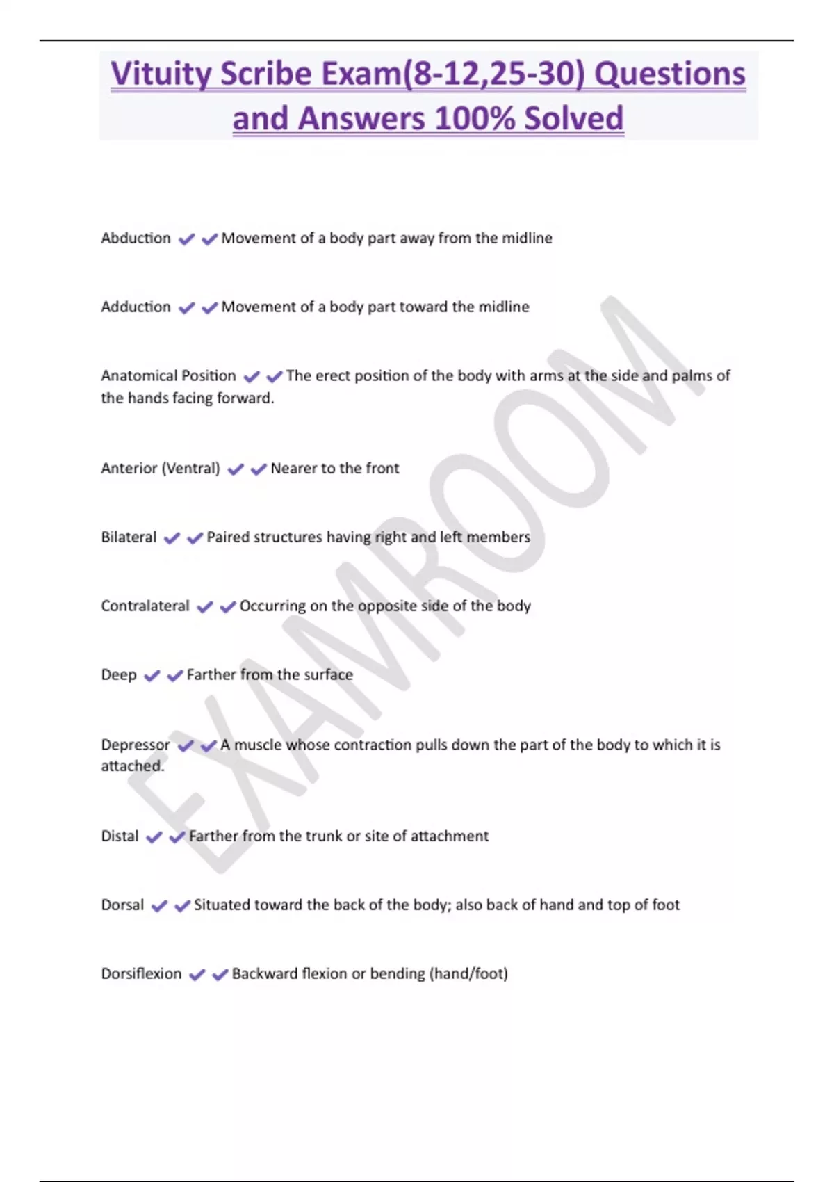 Vituity Scribe Exam(8-12,25-30) Questions and Answers 100% Solved Abduction Movement of a body part away from the midline Adduction Movement of a body part toward the midline Anatomical Position The erect position of the body with arms at the side and palms of the hands facing forward. Anterior (Ventral) Nearer to the front Bilateral Paired structures having right and left members Contralateral Occurring on the opposite side of the body Deep Farther from the surface