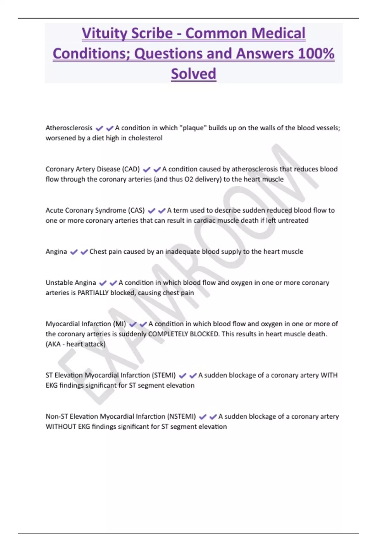 Vituity Scribe - Common Medical Conditions; Questions and Answers 100% Solved Atherosclerosis A condition in which "plaque" builds up on the walls of the blood vessels; worsened by a diet high in cholesterol Coronary Artery Disease (CAD) A condition caused by atherosclerosis that reduces blood flow through the coronary arteries (and thus O2 delivery) to the heart muscle Acute Coronary Syndrome (CAS) A term used to describe sudden reduced blood flow to one or more coronary arteries that can result in cardiac muscle death if left untreated Angina Chest pain caused by an inadequate blood supply to the heart muscle