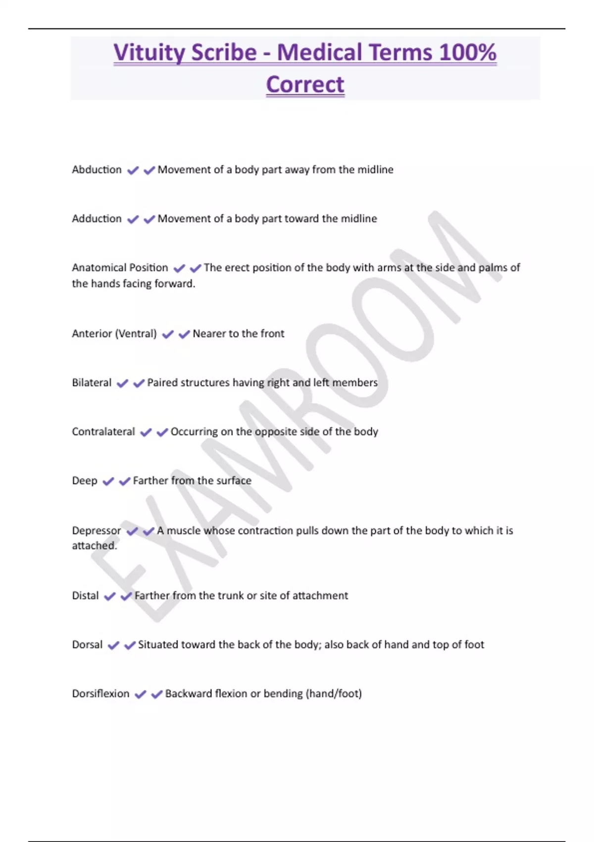 Vituity Scribe - Medical Terms 100% Correct Abduction Movement of a body part away from the midline Adduction Movement of a body part toward the midline Anatomical Position The erect position of the body with arms at the side and palms of the hands facing forward. Anterior (Ventral) Nearer to the front Bilateral Paired structures having right and left members Contralateral Occurring on the opposite side of the body Deep Farther from the surface Depressor A muscle whose contraction pulls down the part of the body to which it i