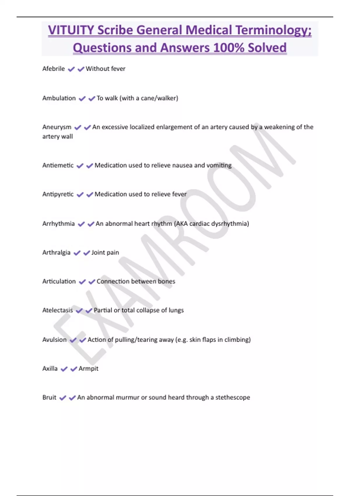 VITUITY Scribe General Medical Terminology; Questions and Answers 100% Solved Afebrile Without fever Ambulation To walk (with a cane/walker) Aneurysm An excessive localized enlargement of an artery caused by a weakening of the artery wall Antiemetic Medication used to relieve nausea and vomiting Antipyretic Medication used to relieve fever Arrhythmia An abnormal heart rhythm (AKA cardiac dysrhythmia) Arthralgia Joint pain Articulation Connection between bones