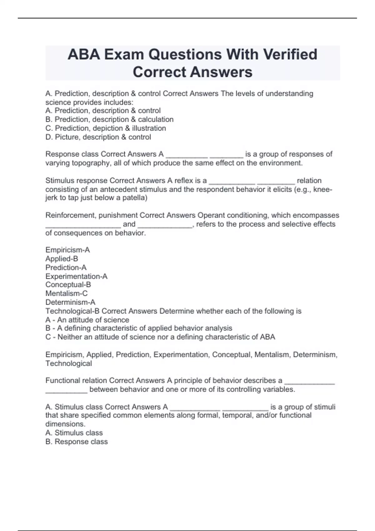 ABA Exam Questions With Verified Correct Answers