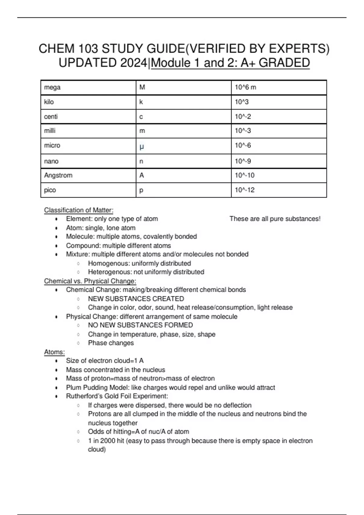 CHEM 103 STUDY GUIDE(VERIFIED BY EXPERTS) UPDATED 2024|Module 1 and 2: A+ GRADED CHEM 103 STUDY GUIDE(VERIFIED BY EXPERTS) UPDATED 2024|Module 1 and 2: A+ GRADED