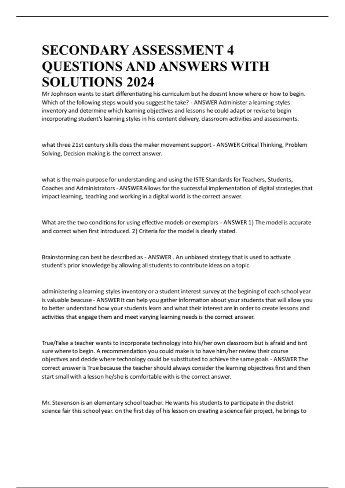 SECONDARY ASSESSMENT 4 QUESTIONS AND ANSWERS WITH SOLUTIONS 2024