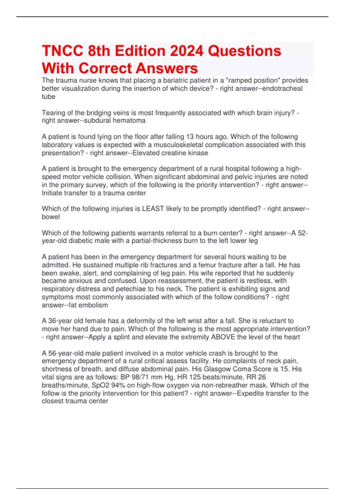 TNCC 8th Edition 2024 Questions With Correct Answers