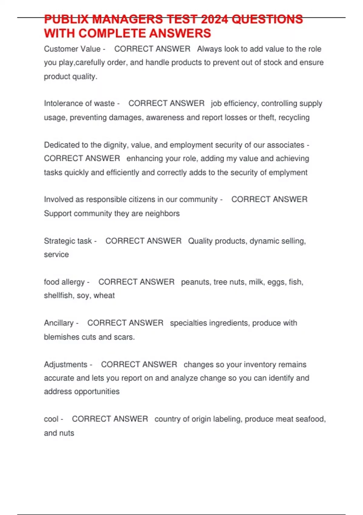 Customer Value - CORRECT ANSWER Always look to add value to the role you play,carefully order, and handle products to prevent out of stock and ensure product quality. Intolerance of waste - CORRECT ANSWER job efficiency, controlling supply usage, preventing damages, awareness and report losses or theft, recycling Dedicated to the dignity, value, and employment security of our associates - CORRECT ANSWER enhancing your role, adding my value and achieving tasks quickly and efficiently and correctly adds to the security of emplyment Involved as responsible citizens in our community - CORRECT ANSWER Support community they are neighbors Strategic task - CORRECT ANSWER Quality products, dynamic selling, service food allergy - CORRECT ANSWER peanuts, tree nuts, milk, eggs, fish, shellfish, soy, wheat Ancillary - CORRECT ANSWER specialties ingredients, produce with blemishes cuts and scars. Adjustments - CORRECT ANSWER changes so your inventory remains accurate and lets you report on and analyze change so you can identify and address opportunities cool - CORRECT ANSWER country of origin labeling, produce meat seafood, and nuts
