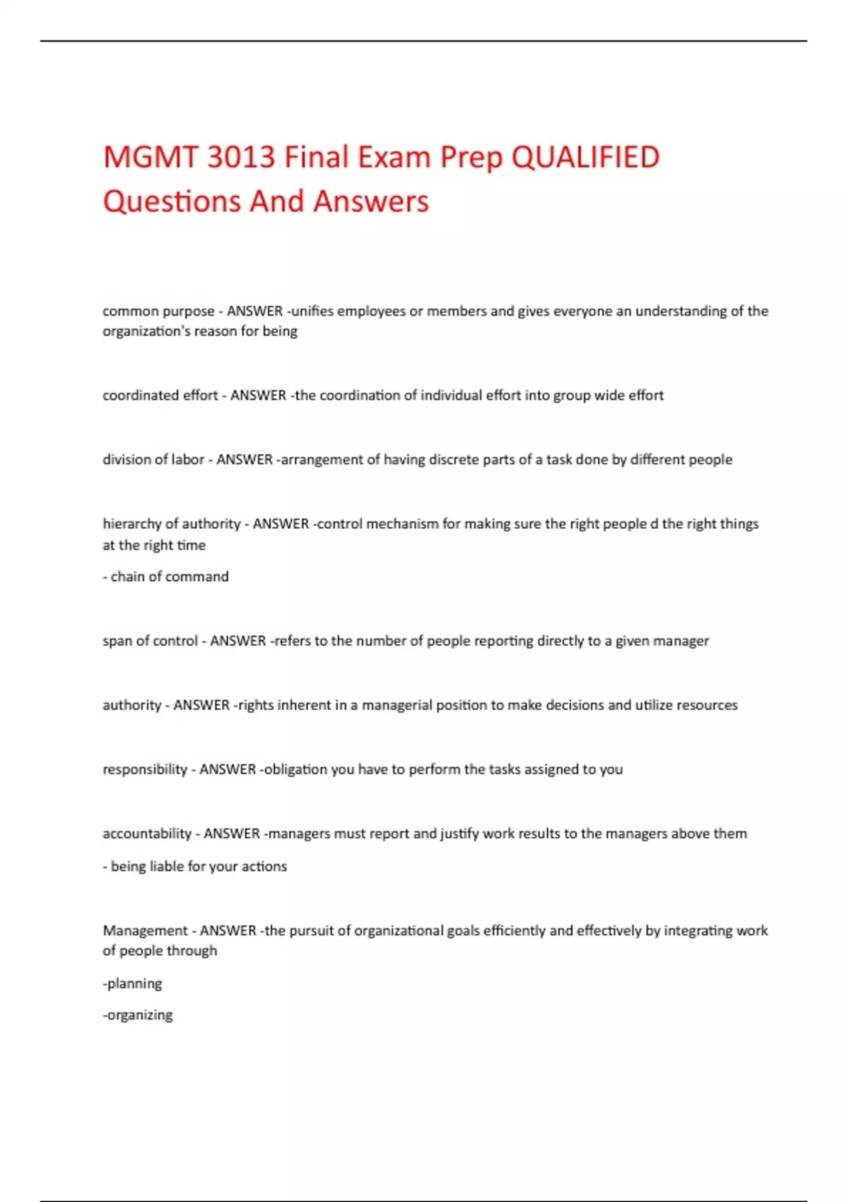 MGMT 3013 Final Exam Prep QUALIFIED Questions And Answers