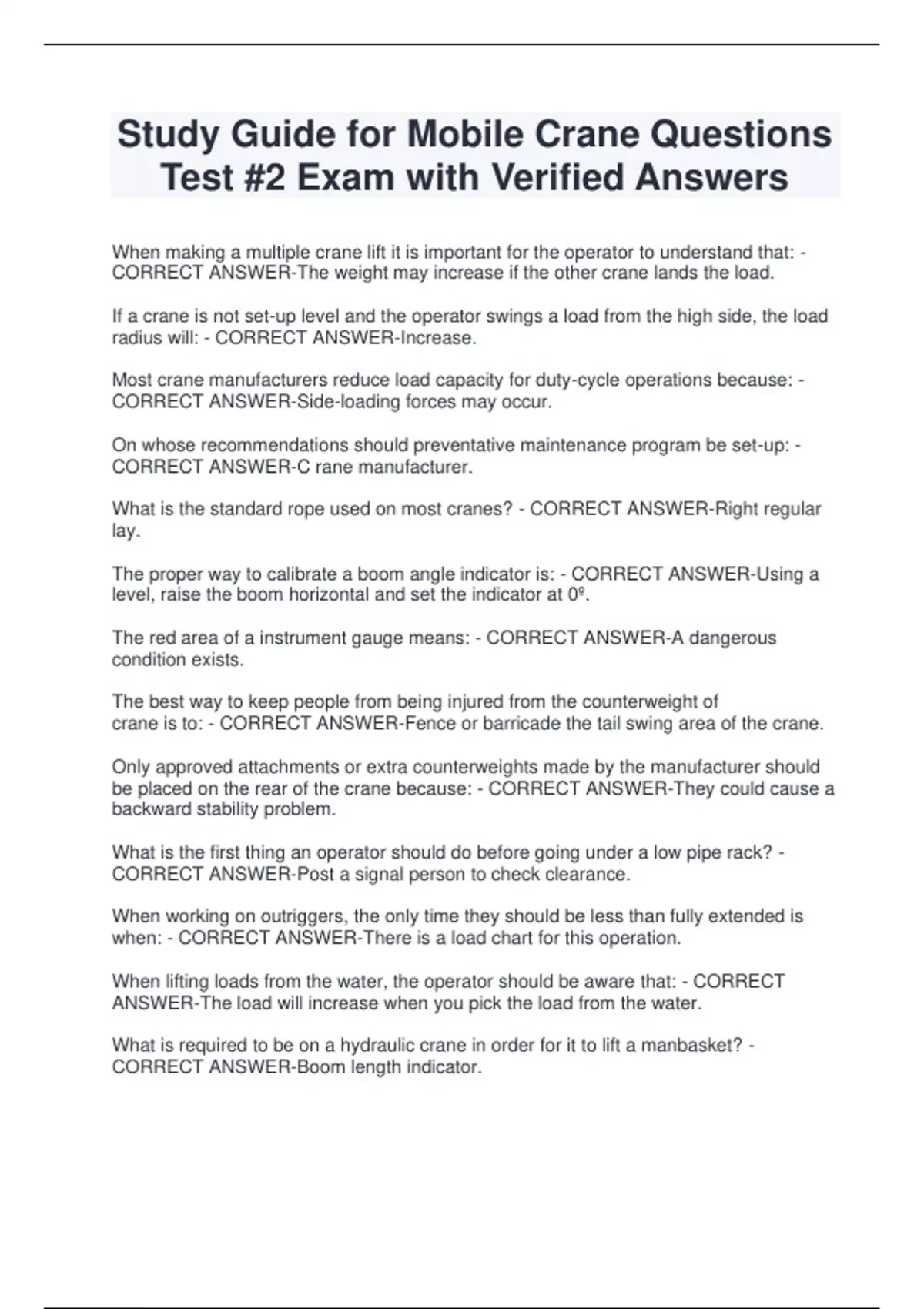 Study Guide for Mobile Crane Questions Test #2 Exam with Verified Answers When making a multiple crane lift it is important for the operator to understand that: - CORRECT ANSWER-The weight may increase if the other crane lands the load. If a crane is not set-up level and the operator swings a load from the high side, the load radius will: - CORRECT ANSWER-Increase. Most crane manufacturers reduce load capacity for duty-cycle operations because: - CORRECT ANSWER-Side-loading forces may occur. On whose recommendations should preventative maintenance program be set-up: - CORRECT ANSWER-C rane manufacturer. What is the standard rope used on most cranes? - CORRECT ANSWER-Right regular lay. The proper way to calibrate a boom angle indicator is: - CORRECT ANSWER-Using a level, raise the boom horizontal and set the indicator at 0º. The red area of a instrument gauge means: - CORRECT ANSWER-A dangerous condition exists. The best way to keep people from being injured from the counterweight of crane is to: - CORRECT ANSWER-Fence or barricade the tail swing area of the crane. Only approved attachments or extra counterweights made by the manufacturer should be placed on the rear of the crane because: - CORRECT ANSWER-They could cause a backward stability problem. What is the first thing an operator should do before going under a low pipe rack? - CORRECT ANSWER-Post a signal person to check clearance. When working on outriggers, the only time they should be less than fully extended is when: - CORRECT ANSWER-There is a load chart for this operation. When lifting loads from the water, the operator should be aware that: - CORRECT ANSWER-The load will increase when you pick the load from the water. What is required to be on a hydraulic crane in order for it to lift a manbasket? - CORRECT ANSWER-Boom length indicator