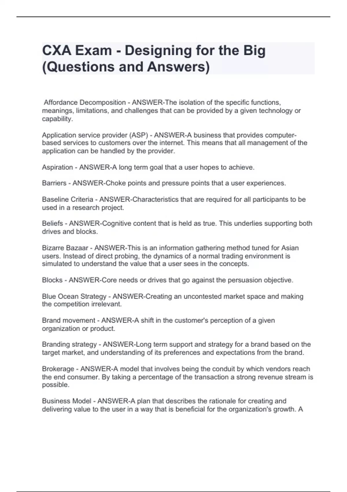 CXA Exam - Designing for the Big (Questions and Answers)CXA Exam - Designing for the Big (Questions and Answers)CXA Exam - Designing for the Big (Questions and Answers)CXA Exam - Designing for the Big (Questions and Answers) Affordance Decomposition - ANSWER-The isolation of the specific functions, meanings, limitations, and challenges that can be provided by a given technology or capability. Application service provider (ASP) - ANSWER-A business that provides computer-based services to customers over the internet. This means that all management of the application can be handled by the provider.