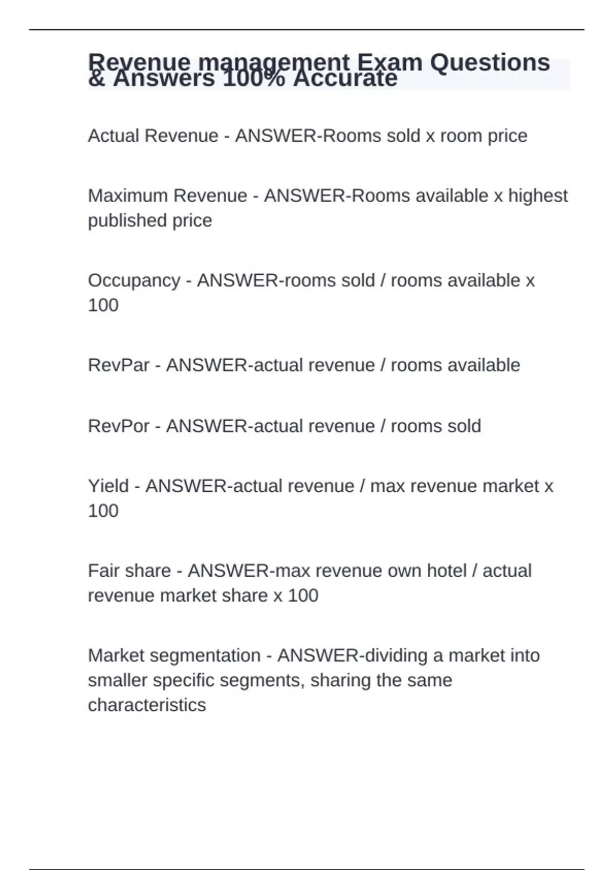 Actual Revenue - ANSWER-Rooms sold x room price Maximum Revenue - ANSWER-Rooms available x highest published price Occupancy - ANSWER-rooms sold / rooms available x 100 RevPar - ANSWER-actual revenue / rooms available RevPor - ANSWER-actual revenue / rooms sold Yield - ANSWER-actual revenue / max revenue market x 100 Fair share - ANSWER-max revenue own hotel / actual revenue market share x 100