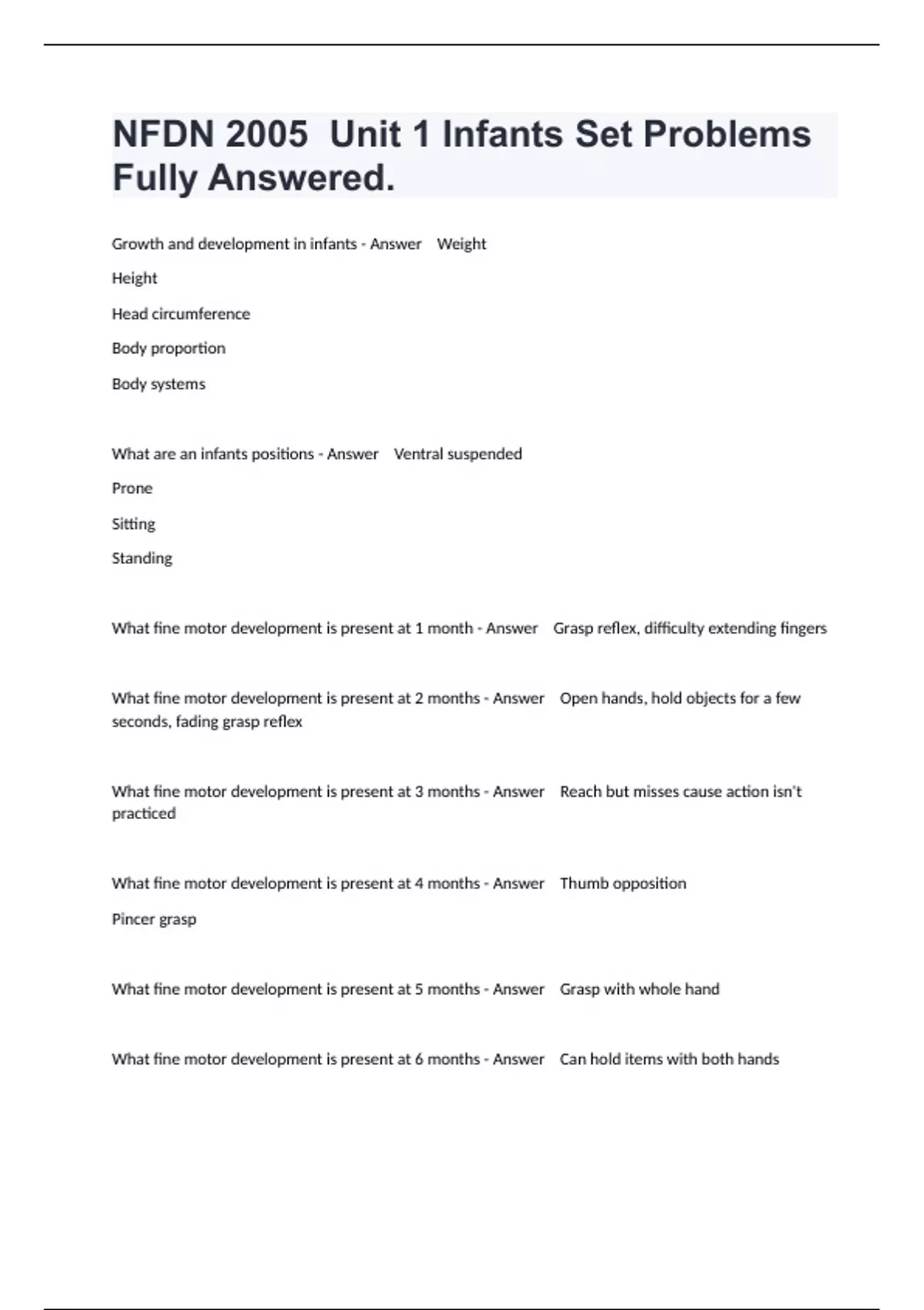 Growth and development in infants - Answer Weight Height Head circumference Body proportion Body systems What are an infants positions - Answer Ventral suspended Prone Sitting Standing What fine motor development is present at 1 month - Answer Grasp reflex, difficulty extending fingers What fine motor development is present at 2 months - Answer Open hands, hold objects for a few seconds, fading grasp reflex What fine motor development is present at 3 months - Answer Reach but misses cause action isn't practiced What fine motor development is present at 4 months - Answer Thumb opposition Pincer grasp What fine motor development is present at 5 months - Answer Grasp with whole hand What fine motor development is present at 6 months - Answer Can hold items with both hands