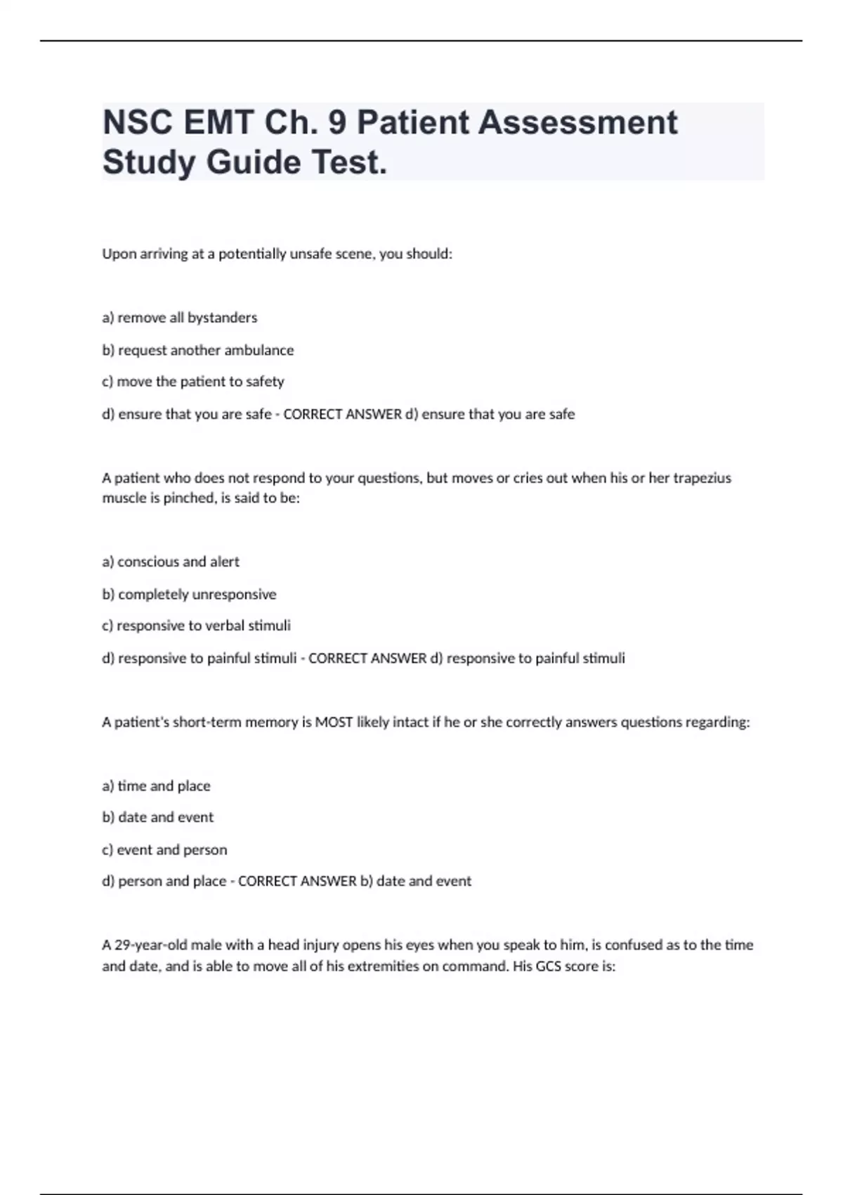 NSC EMT Ch. 9 Patient Assessment Study Guide Test. Upon arriving at a potentially unsafe scene, you should: a) remove all bystanders b) request another ambulance c) move the patient to safety d) ensure that you are safe - CORRECT ANSWER d) ensure that you are safe A patient who does not respond to your questions, but moves or cries out when his or her trapezius muscle is pinched, is said to be: a) conscious and alert b) completely unresponsive c) responsive to verbal stimuli d) responsive to painful stimuli - CORRECT ANSWER d) responsive to painful stimuli A patient's short-term memory is MOST likely intact if he or she correctly answers questions regarding: a) time and place b) date and event c) event and person d) person and place - CORRECT ANSWER b) date and event A 29-year-old male with a head injury opens his eyes when you speak to him, is confused as to the time and date, and is able to move all of his extremities on command. His GCS score is: a) 10 b) 12 c) 13 d) 14 - CORRECT ANSWER c) 13