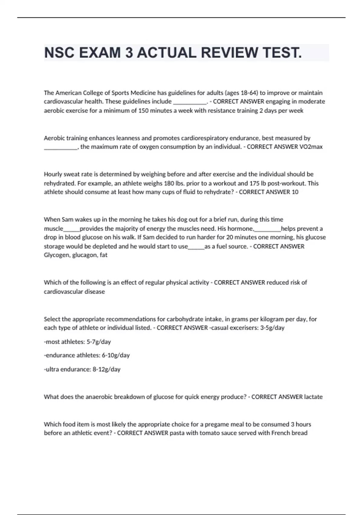 NSC EXAM 3 ACTUAL REVIEW TEST. The American College of Sports Medicine has guidelines for adults (ages 18-64) to improve or maintain cardiovascular health. These guidelines include __________. - CORRECT ANSWER engaging in moderate aerobic exercise for a minimum of 150 minutes a week with resistance training 2 days per week Aerobic training enhances leanness and promotes cardiorespiratory endurance, best measured by __________, the maximum rate of oxygen consumption by an individual. - CORRECT ANSWER VO2max Hourly sweat rate is determined by weighing before and after exercise and the individual should be rehydrated. For example, an athlete weighs 180 lbs. prior to a workout and 175 lb post-workout. This athlete should consume at least how many cups of fluid to rehydrate? - CORRECT ANSWER 10 When Sam wakes up in the morning he takes his dog out for a brief run, during this time muscle_____provides the majority of energy the muscles need. His hormone,________helps prevent a drop in blood glucose on his walk. If Sam decided to run harder for 20 minutes one morning, his glucose storage would be depleted and he would start to use_____as a fuel source. - CORRECT ANSWER Glycogen, glucagon, fat Which of the following is an effect of regular physical activity - CORRECT ANSWER reduced risk of cardiovascular disease Select the appropriate recommendations for carbohydrate intake, in grams per kilogram per day, for each type of athlete or individual listed. - CORRECT ANSWER -casual excerisers: 3-5g/day -most athletes: 5-7g/day -endurance athletes: 6-10g/day -ultra endurance: 8-12g/day What does the anaerobic breakdown of glucose for quick energy produce? - CORRECT ANSWER lactate Which food item is most likely the appropriate choice for a pregame meal to be consumed 3 hours before an athletic event? - CORRECT ANSWER pasta with tomato sauce served with French bread Aerobic metabolism depends more heavily on __________ for fuel, to conserve glycogen. - CORRECT ANSWER fatty acids A mild stimulant that is safe in low doses (3 mg/kg of body weight) that can enhance performance is___Sodium bicarbonate is an example of a(n)____that may have beneficial effects to reduce acid build-up in the muscle following high-intensity exercise. It is thought that___can enhance short-term repetitive high-intensity performance, but research is inconclusive on this ergogenic aid. _____are the most dangerous ergogenic aids because of the damaging side effects if abused. - CORRECT ANSWER caffeine, buffer, creatine, anabolic steriods