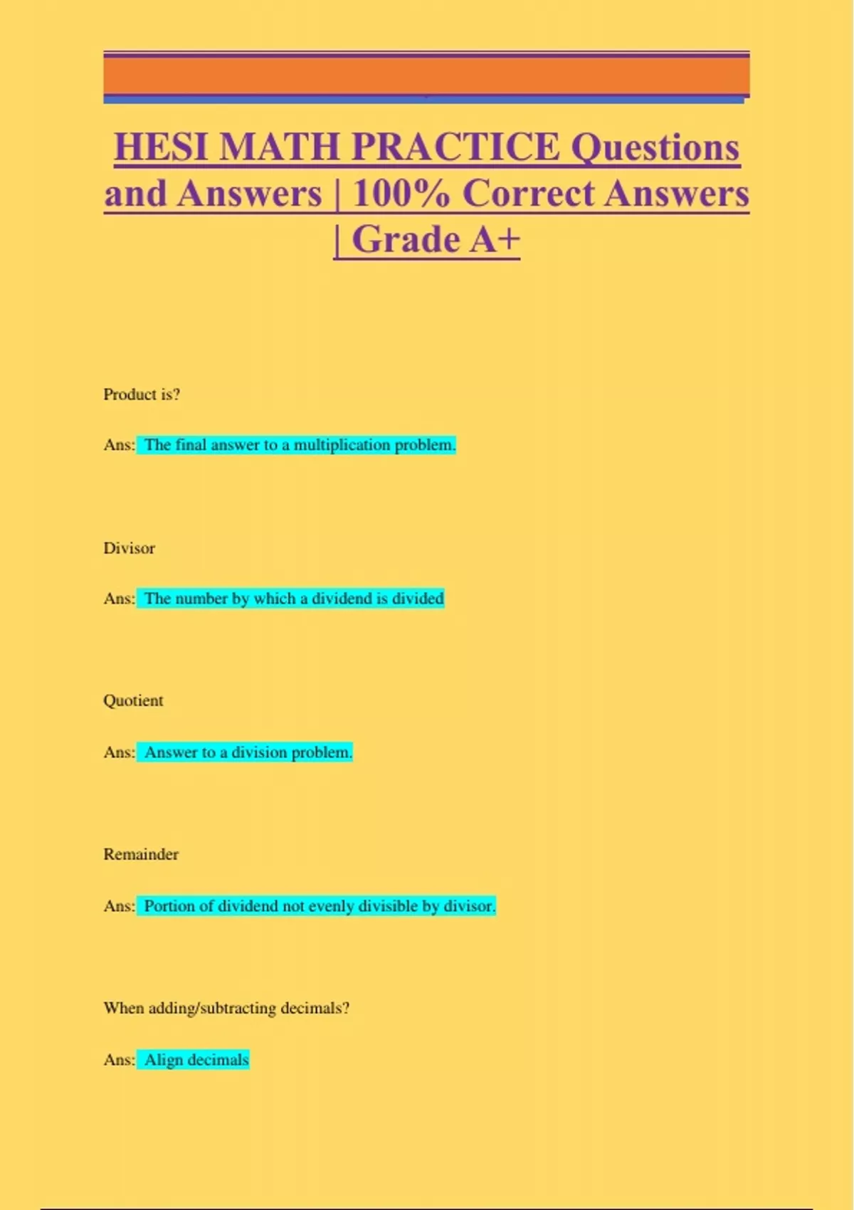 HESI MATH PRACTICE Questions and Answers | 100% Correct Answers | Grade A+