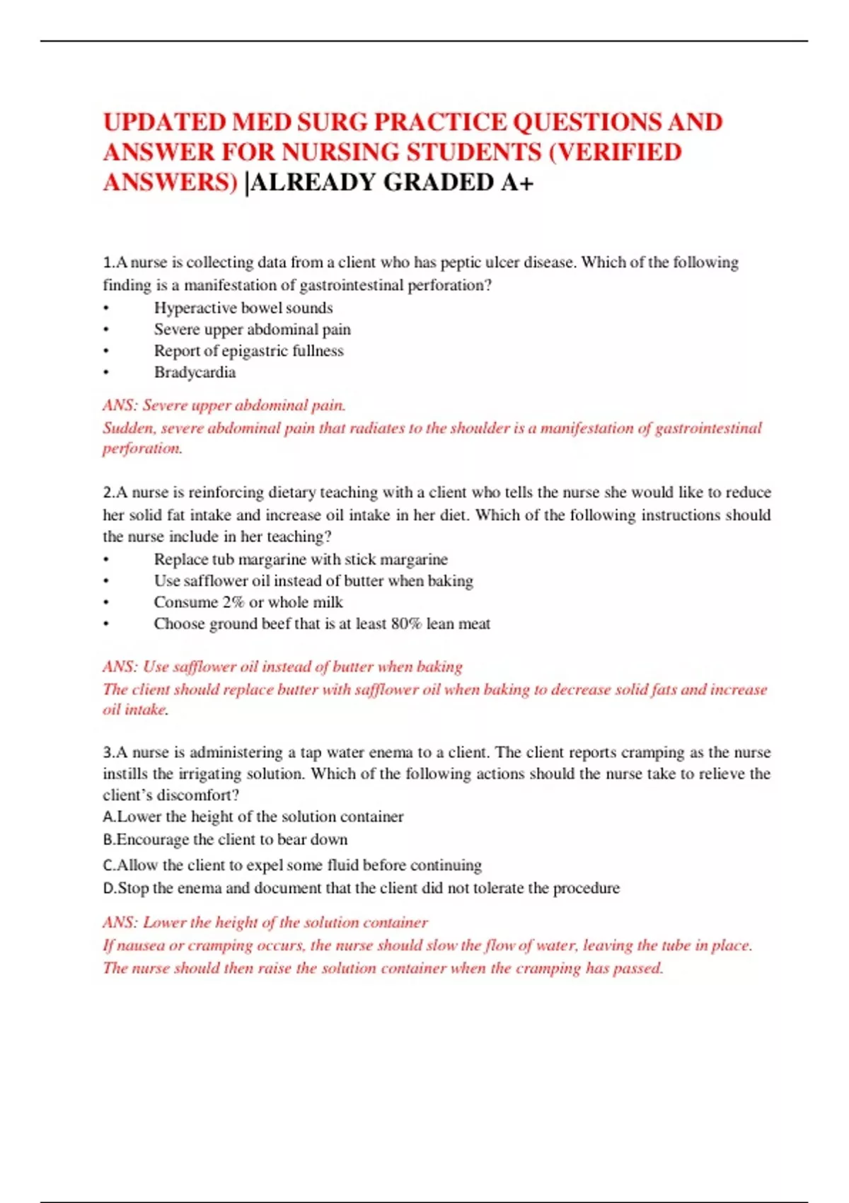 UPDATED MED SURG PRACTICE QUESTIONS AND ANSWER FOR NURSING STUDENTS (VERIFIED ANSWERS) ALREADY GRADED A+