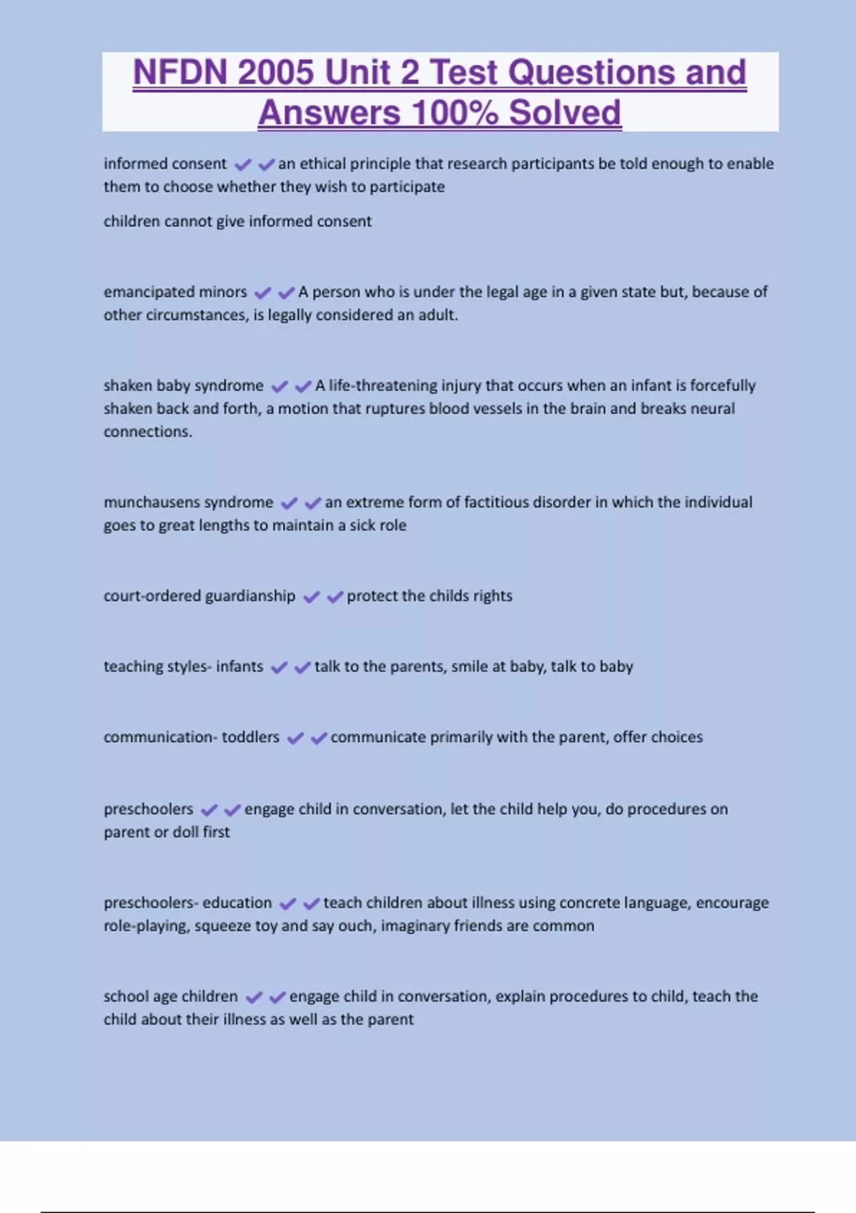 NFDN 2005 Unit 2 Test Questions and Answers 100% Solved informed consent an ethical principle that research participants be told enough to enable them to choose whether they wish to participate children cannot give informed consent emancipated minors A person who is under the legal age in a given state but, because of other circumstances, is legally considered an adult. shaken baby syndrome A life-threatening injury that occurs when an infant is forcefully shaken back and forth, a motion that ruptures blood vessels in the brain and breaks neural connections. munchausens syndrome an extreme form of factitious disorder in which the individual goes to great lengths to maintain a sick role