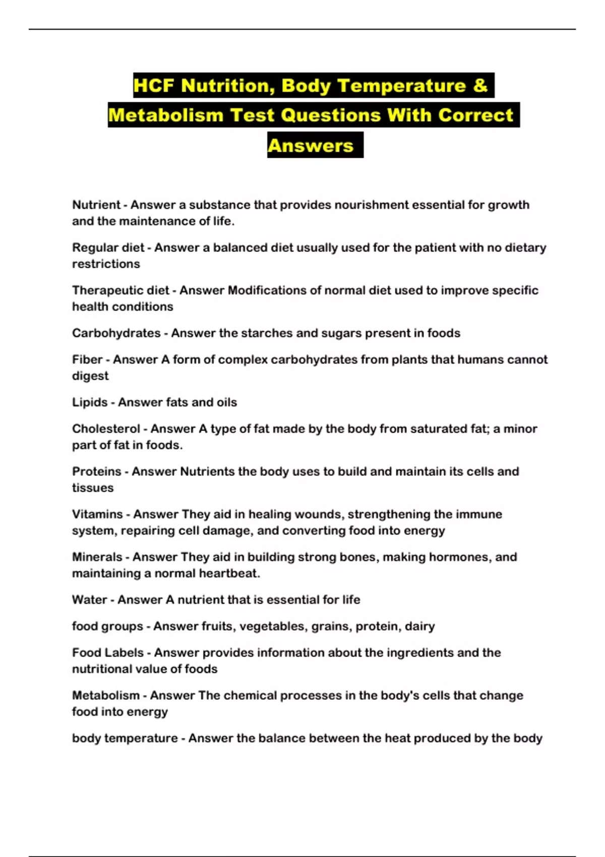 HCF Nutrition, Body Temperature & Metabolism Test Questions With Correct Answers ...