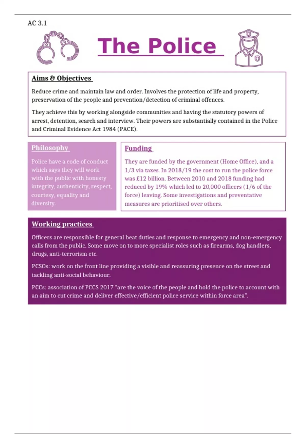 This document includes notes on AC 3.1 for the unit 4 criminology exam. It contains posters on each agency detailing their aims, working practices, funding, etc. Also provides all the necessary content to get an A.