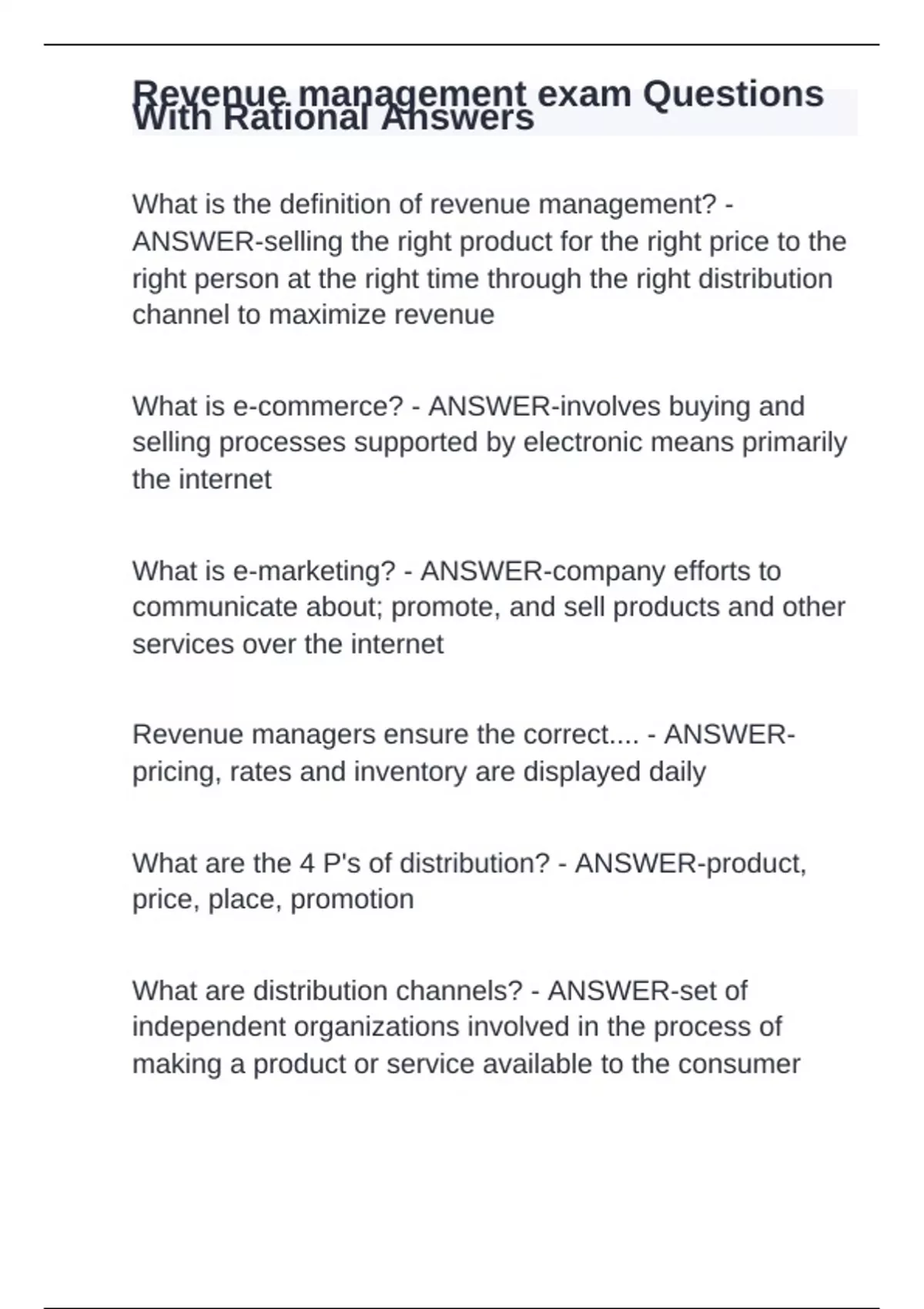 What is the definition of revenue management? - ANSWER-selling the right product for the right price to the right person at the right time through the right distribution channel to maximize revenue What is e-commerce? - ANSWER-involves buying and selling processes supported by electronic means primarily the internet What is e-marketing? - ANSWER-company efforts to communicate about; promote, and sell products and other services over the internet Revenue managers ensure the correct.... - ANSWER-pricing, rates and inventory are displayed daily What are the 4 P's of distribution? - ANSWER-product, price, place, promotion What are distribution channels? - ANSWER-set of independent organizations involved in the process of making a product or service available to the consumer