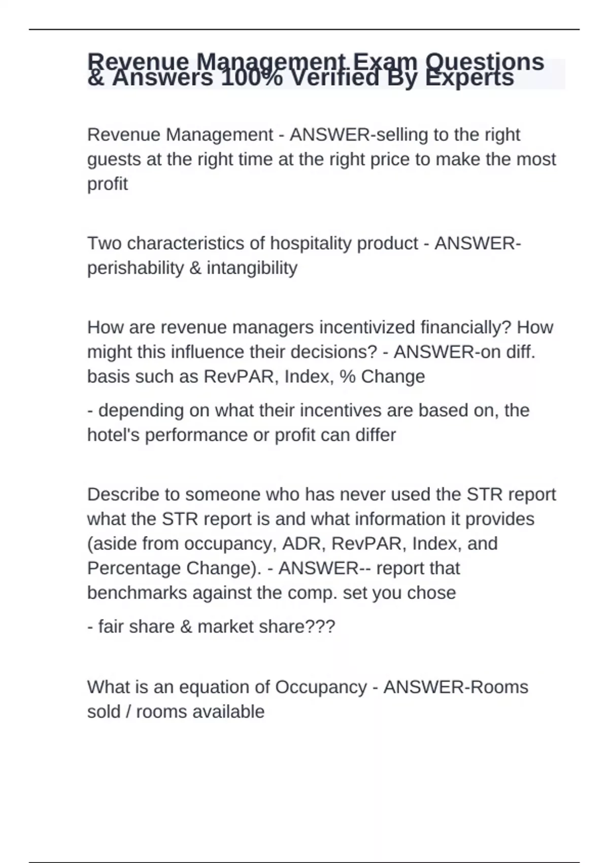 Revenue Management Exam Questions & Answers 100% Verified By Experts