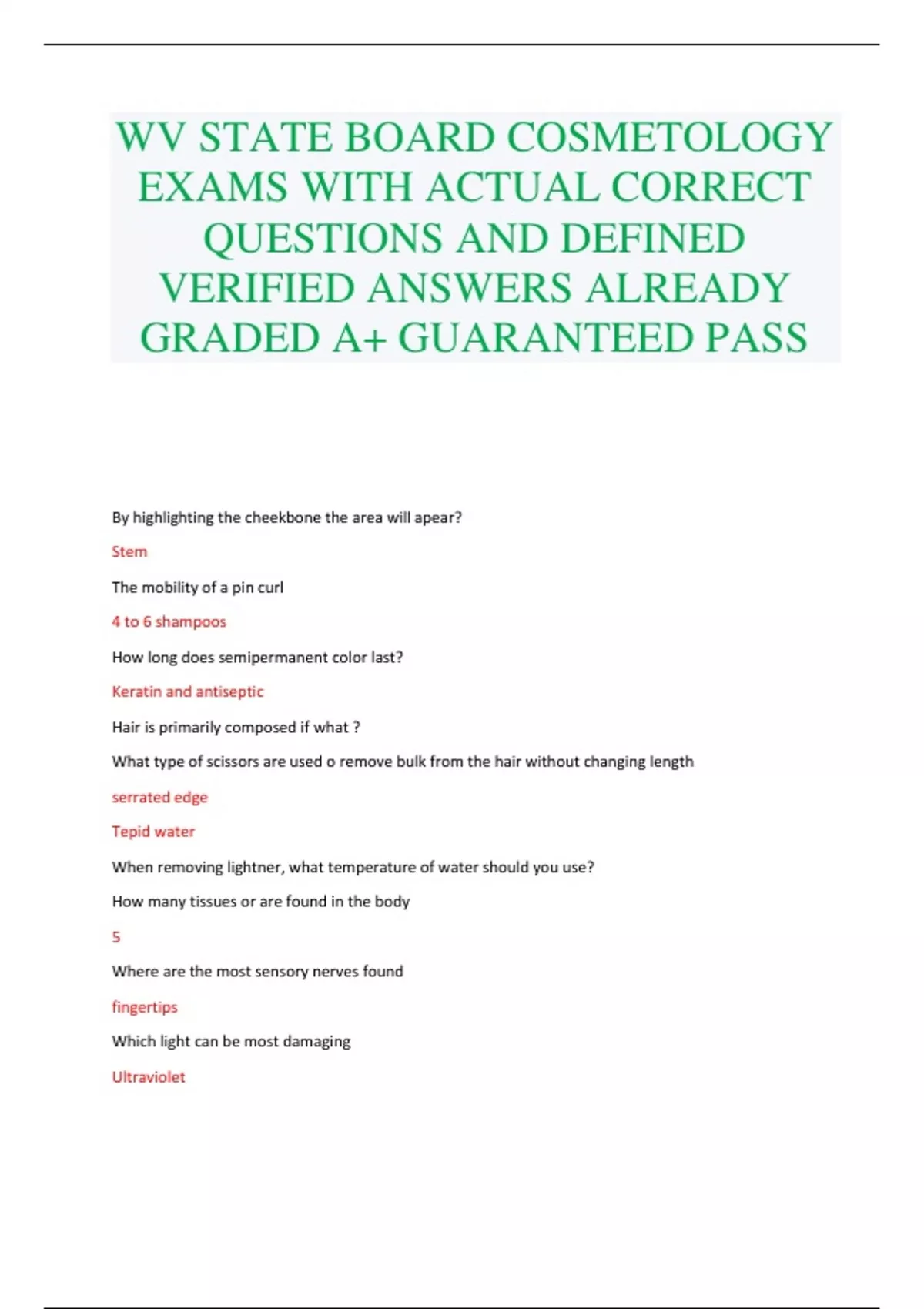 WV STATE BOARD COSMETOLOGY EXAMS WITH ACTUAL CORRECT QUESTIONS AND DEFINED VERIFIED ANSWERS ALREADY GRADED A+ GUARANTEED PASS