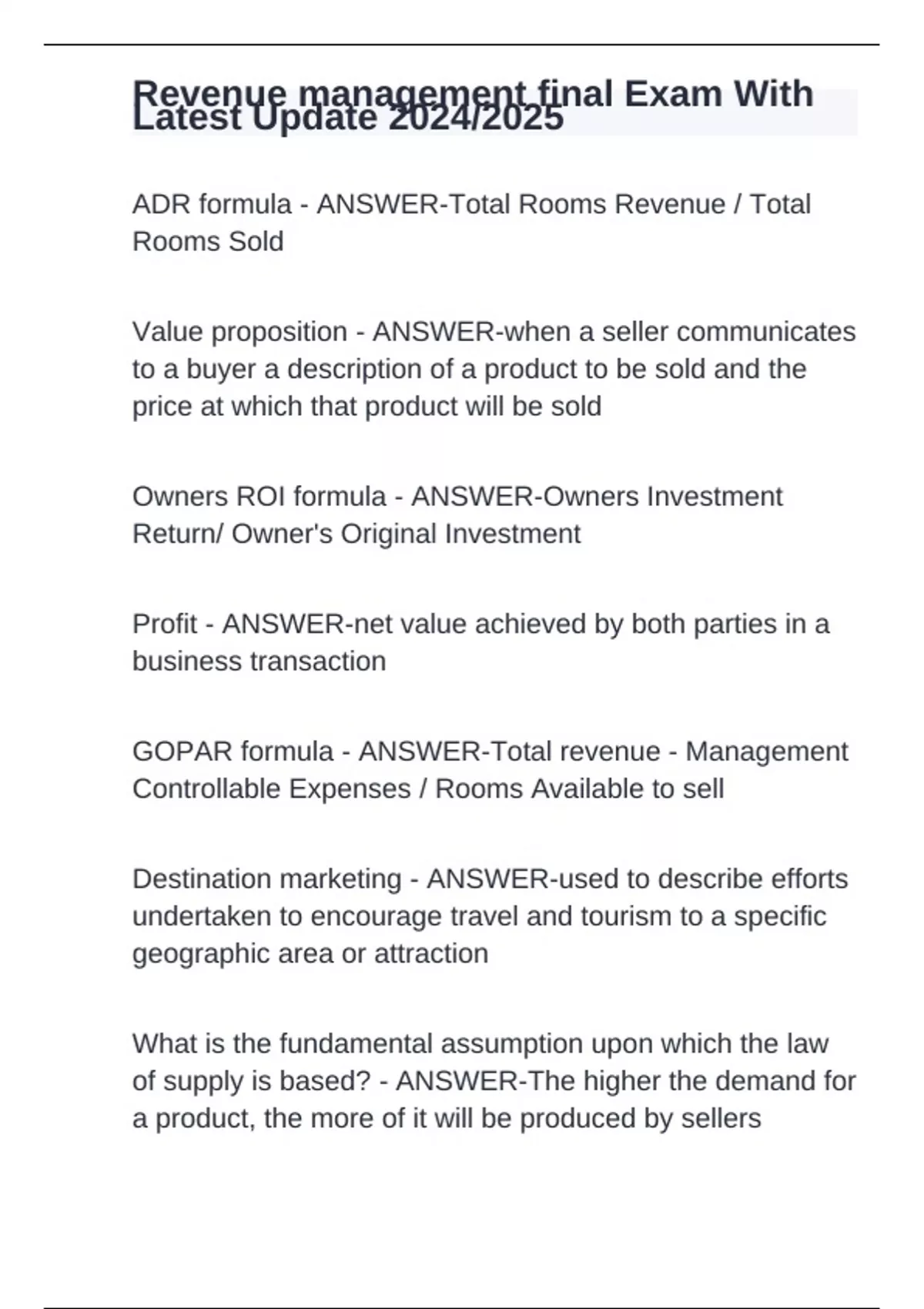 ADR formula - ANSWER-Total Rooms Revenue / Total Rooms Sold Value proposition - ANSWER-when a seller communicates to a buyer a description of a product to be sold and the price at which that product will be sold Owners ROI formula - ANSWER-Owners Investment Return/ Owner's Original Investment Profit - ANSWER-net value achieved by both parties in a business transaction GOPAR formula - ANSWER-Total revenue - Management Controllable Expenses / Rooms Available to sell Destination marketing - ANSWER-used to describe efforts undertaken to encourage travel and tourism to a specific geographic area or attraction