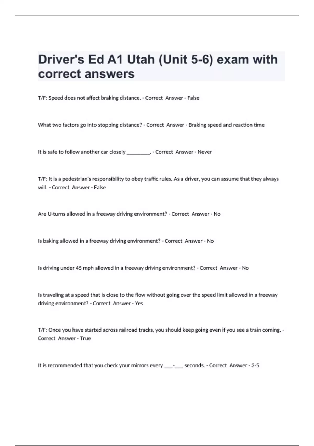 Driver's Ed A1 Utah (Unit 5-6) exam with correct answers