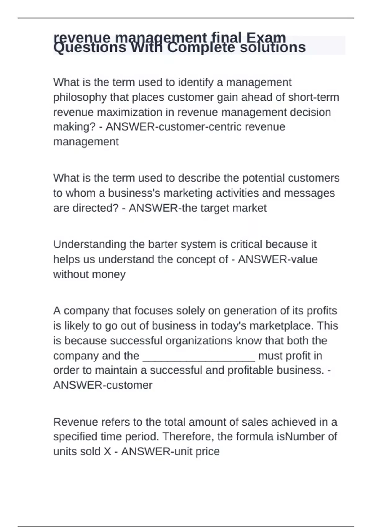 What is the term used to identify a management philosophy that places customer gain ahead of short-term revenue maximization in revenue management decision making? - ANSWER-customer-centric revenue management What is the term used to describe the potential customers to whom a business's marketing activities and messages are directed? - ANSWER-the target market Understanding the barter system is critical because it helps us understand the concept of - ANSWER-value without money A company that focuses solely on generation of its profits is likely to go out of business in today's marketplace. This is because successful organizations know that both the company and the __________________ must profit in order to maintain a successful and profitable business. - ANSWER-customer