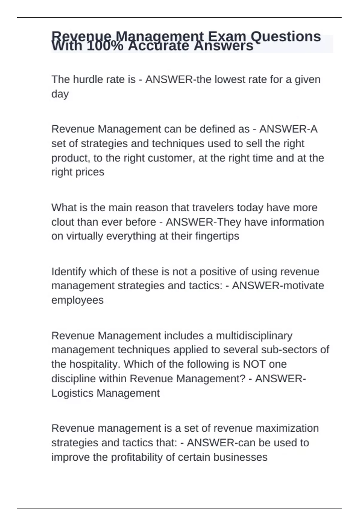 The hurdle rate is - ANSWER-the lowest rate for a given day Revenue Management can be defined as - ANSWER-A set of strategies and techniques used to sell the right product, to the right customer, at the right time and at the right prices What is the main reason that travelers today have more clout than ever before - ANSWER-They have information on virtually everything at their fingertips Identify which of these is not a positive of using revenue management strategies and tactics: - ANSWER-motivate employees Revenue Management includes a multidisciplinary management techniques applied to several sub-sectors of the hospitality. Which of the following is NOT one discipline within Revenue Management? - ANSWER-Logistics Management